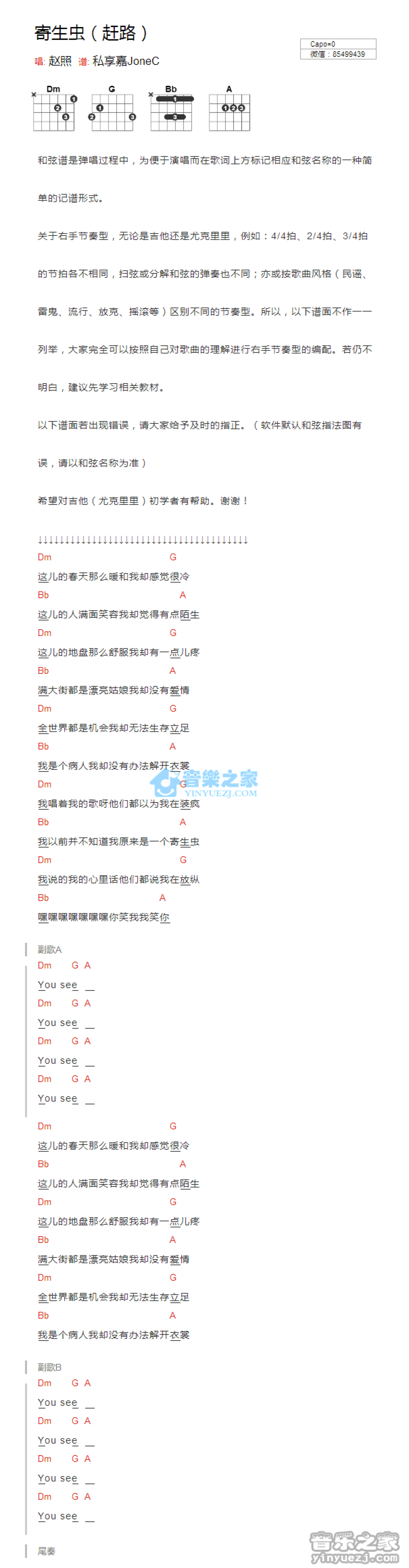 曲谱介绍: 《寄生虫》吉他和弦弹唱谱