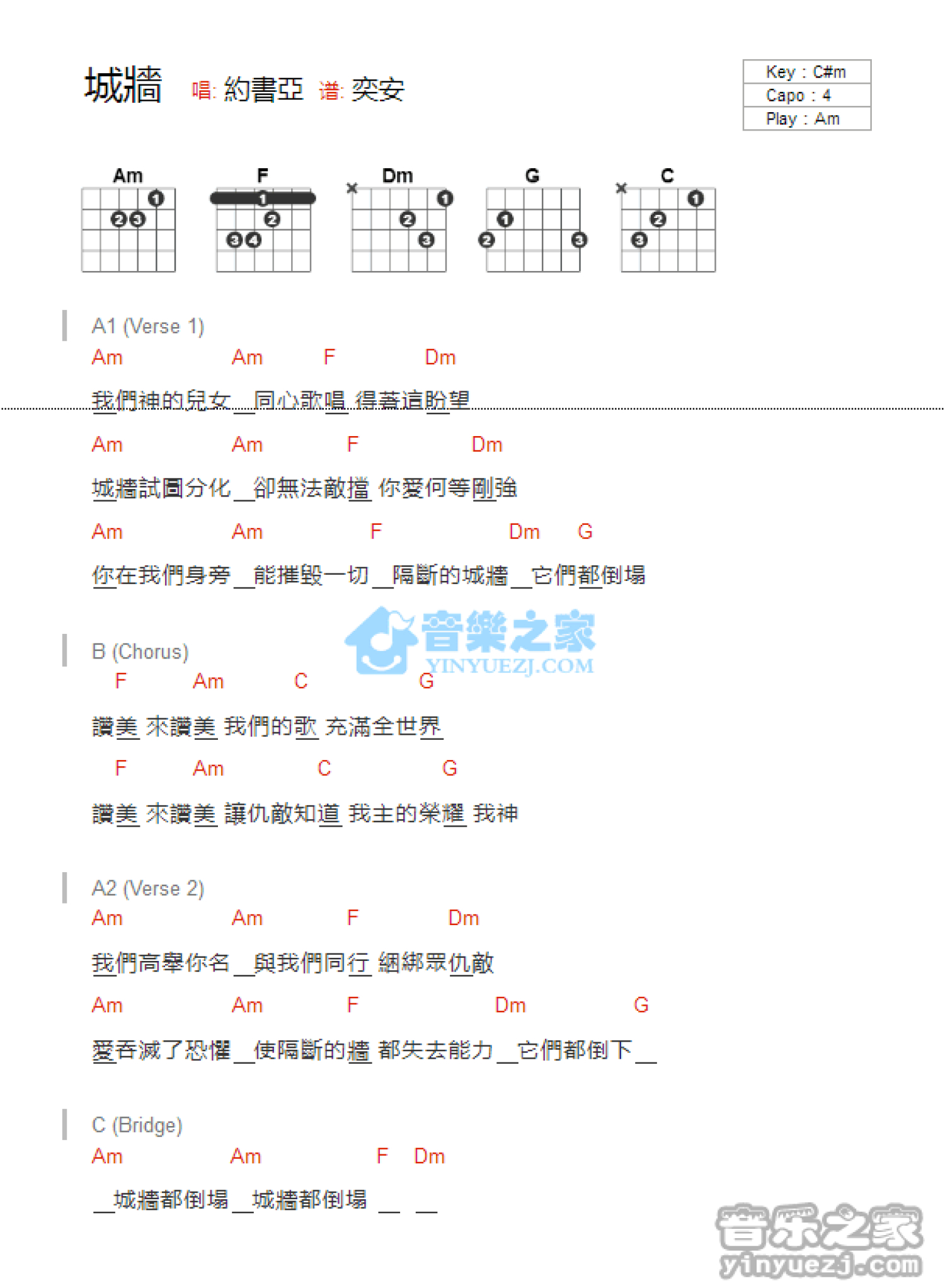曲谱介绍: Am调版 约书亚《城墙》吉他和弦弹唱谱