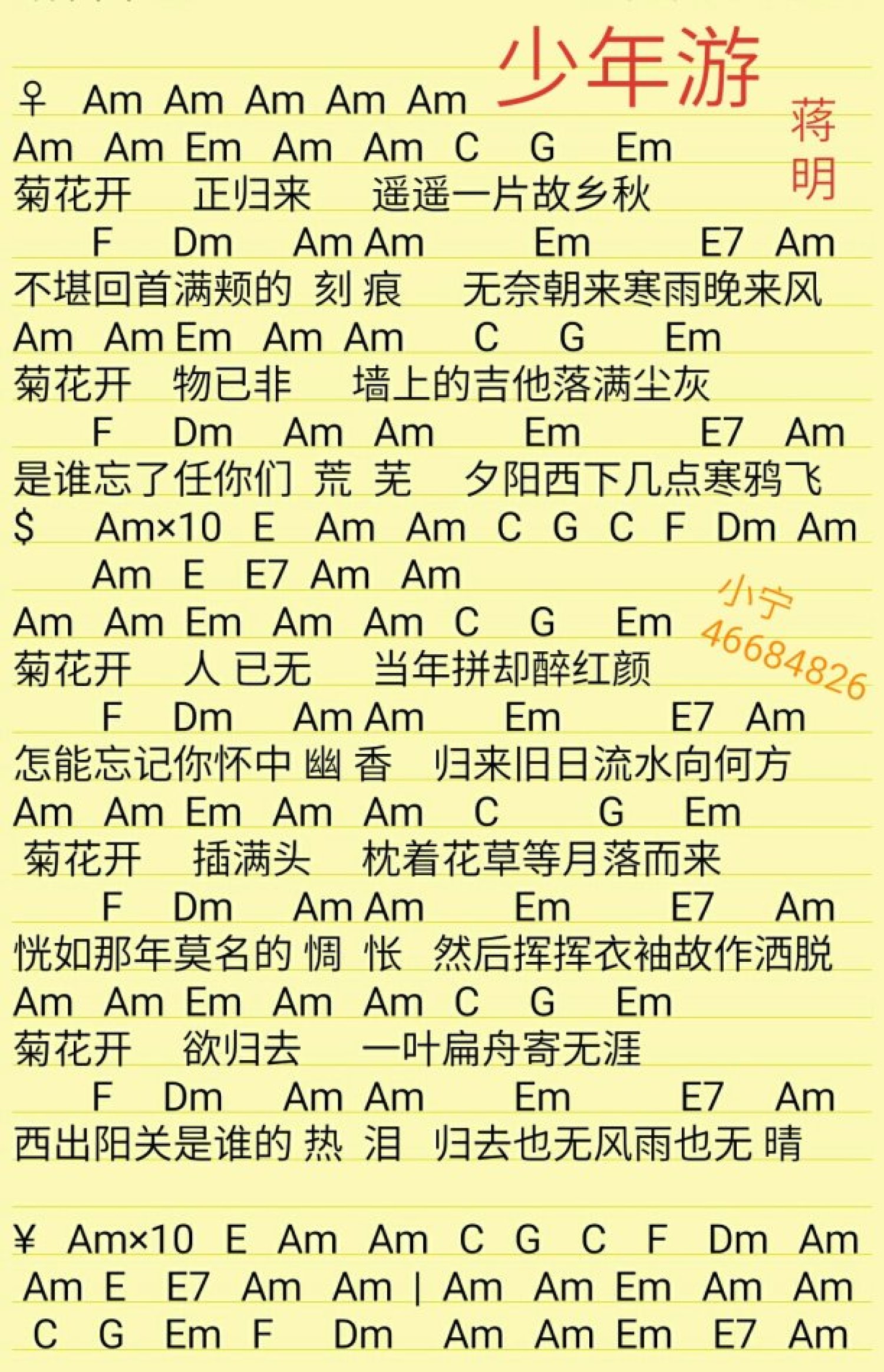 曲谱介绍: 蒋明《少年游》吉他和弦弹唱谱