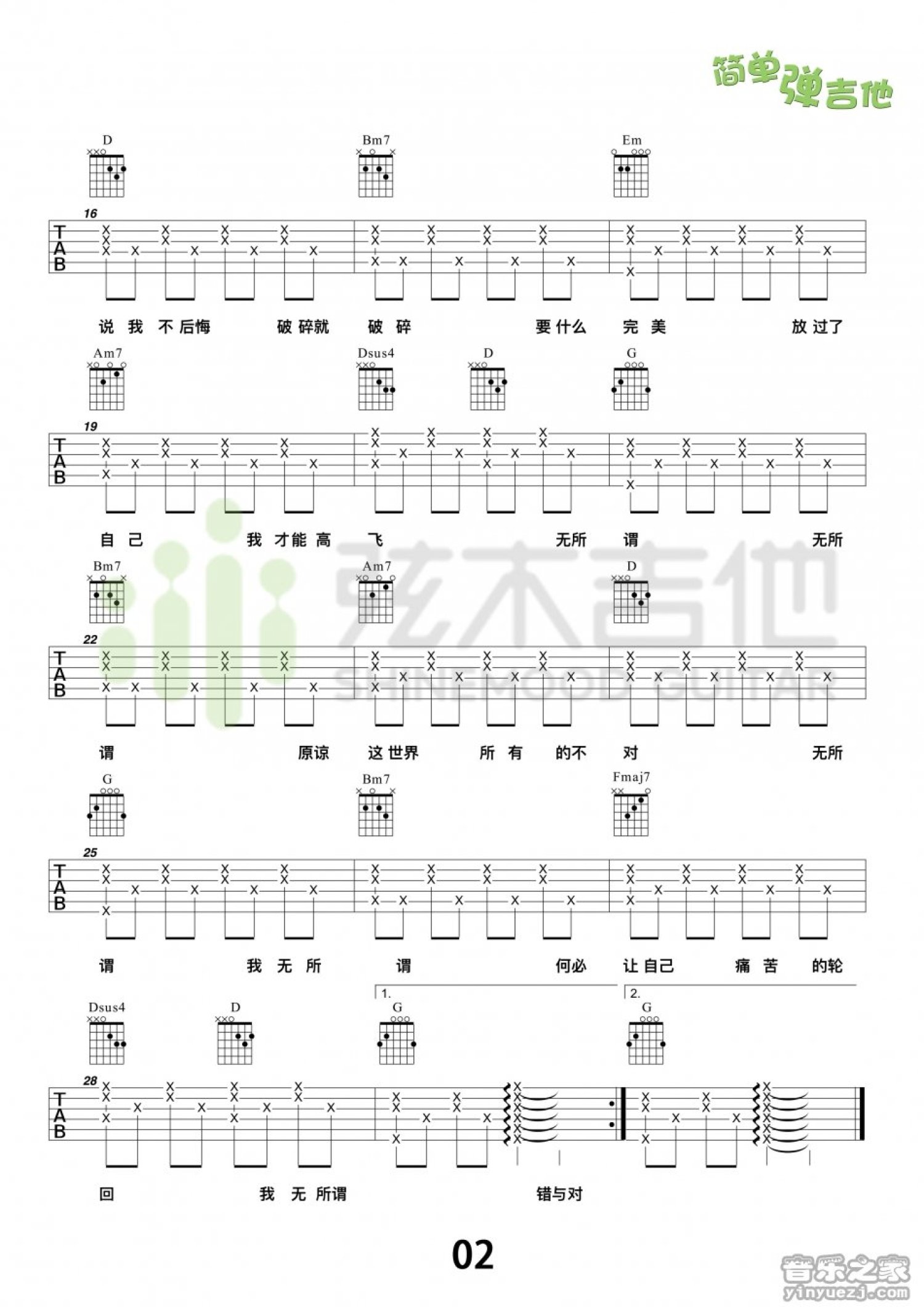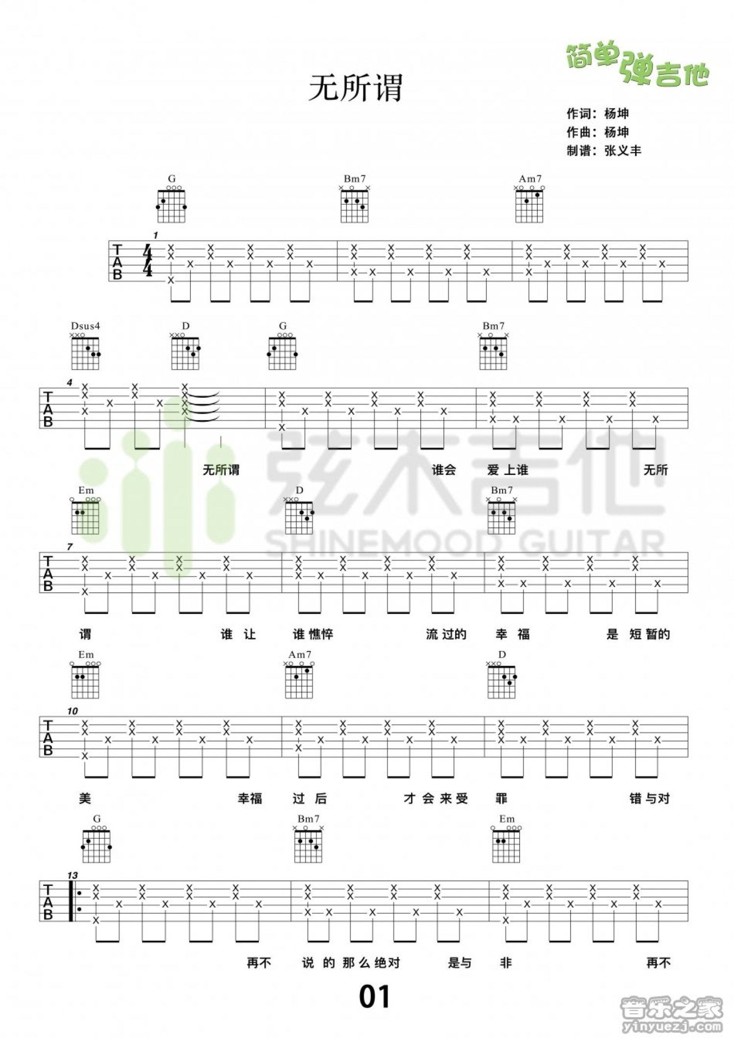 曲谱介绍: 弦木简单版 杨坤《无所谓》吉他弹唱六线谱