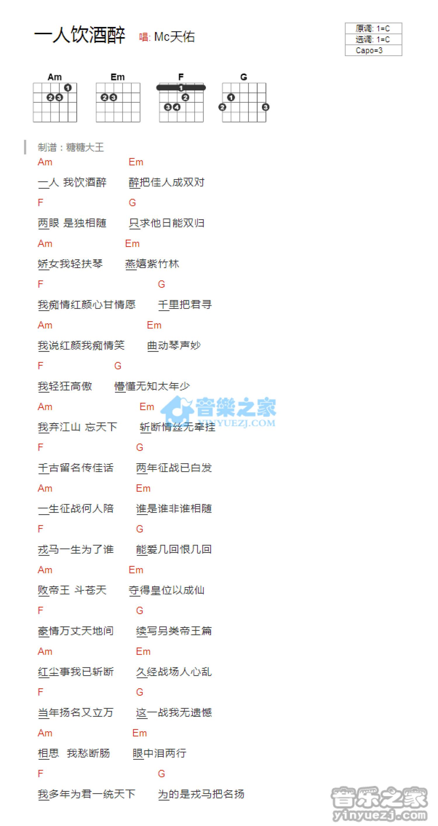 曲谱介绍: C调版 Mc天佑《一人饮酒醉》吉他和弦弹唱谱