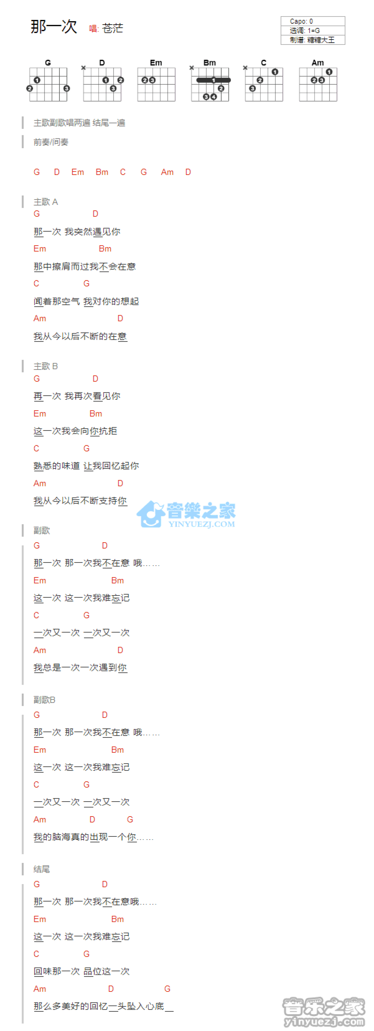 曲谱介绍: G调版 苍茫《那一次》吉他和弦弹唱谱