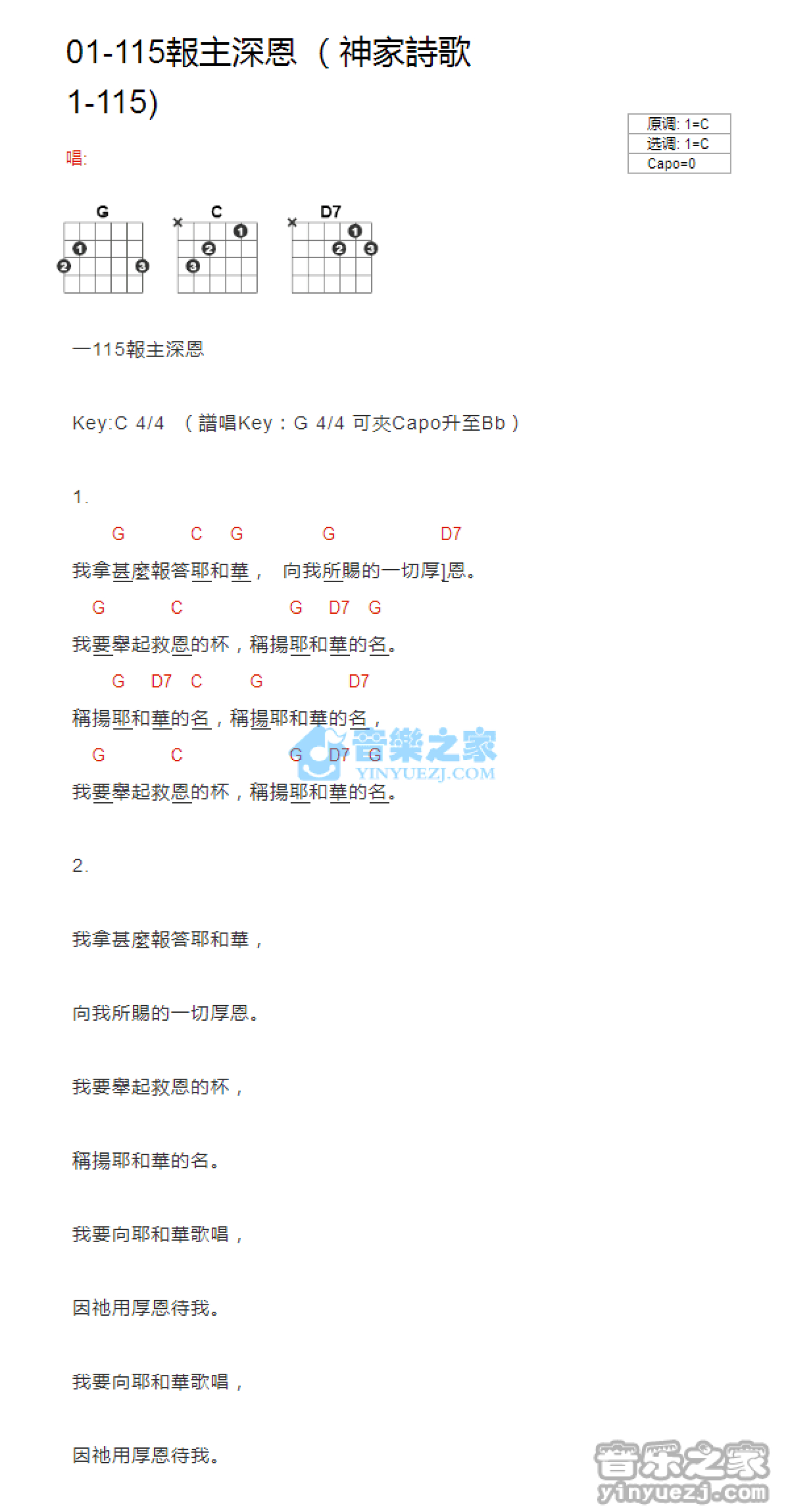 曲谱介绍: C调版 神家诗歌1-115《报主深恩》吉他和弦弹唱谱