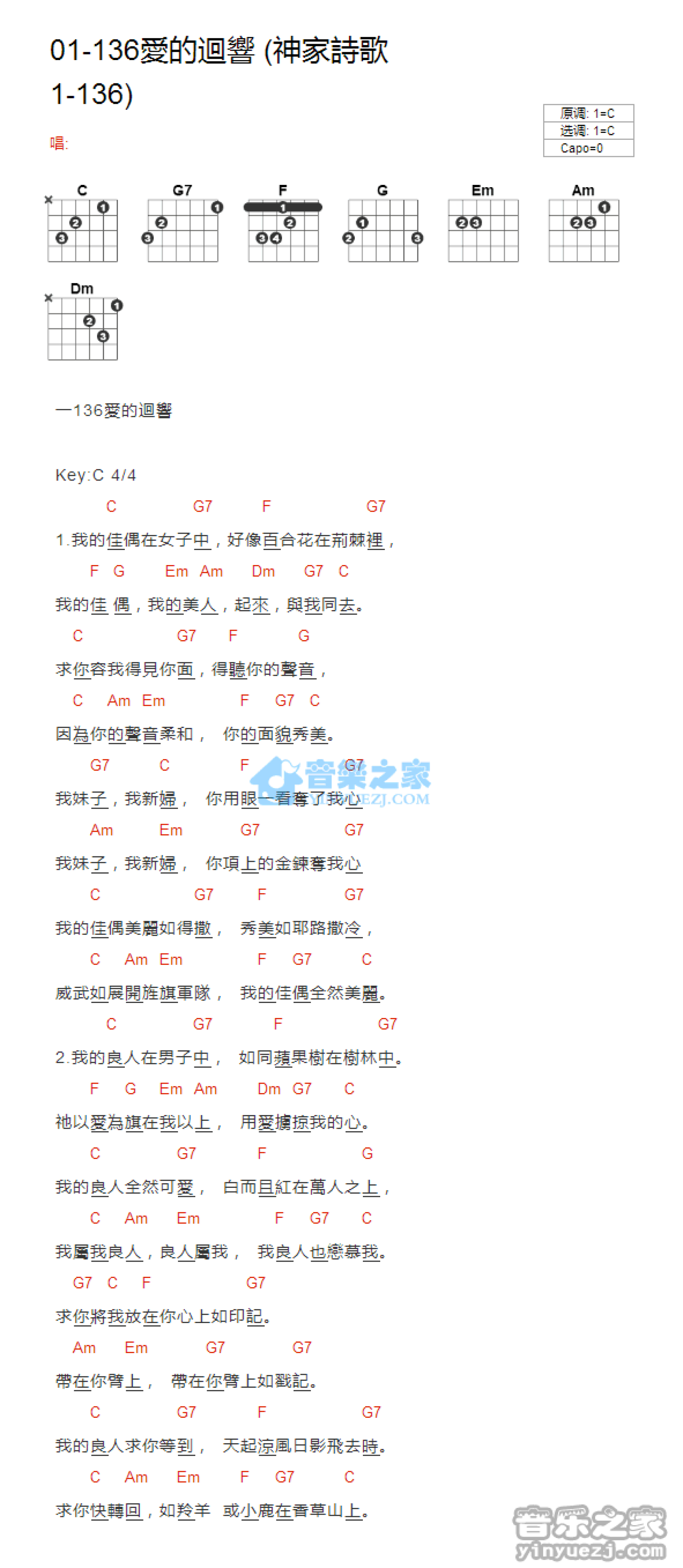 曲谱介绍: C调版01-136《爱的回响》吉他和弦弹唱谱