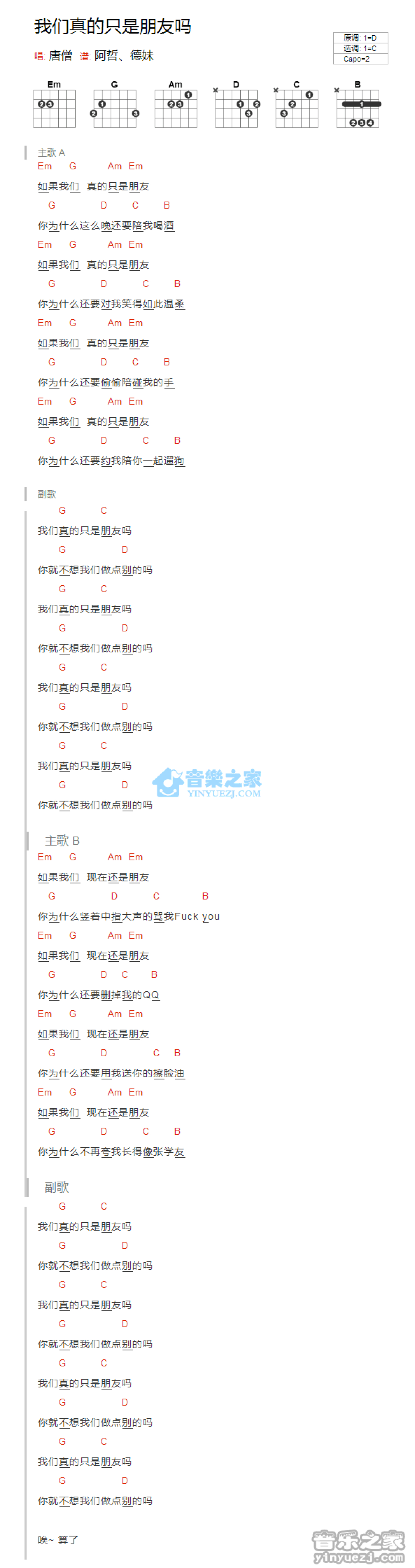 曲谱介绍: C调版《我们真的只是朋友吗》吉他和弦弹唱谱