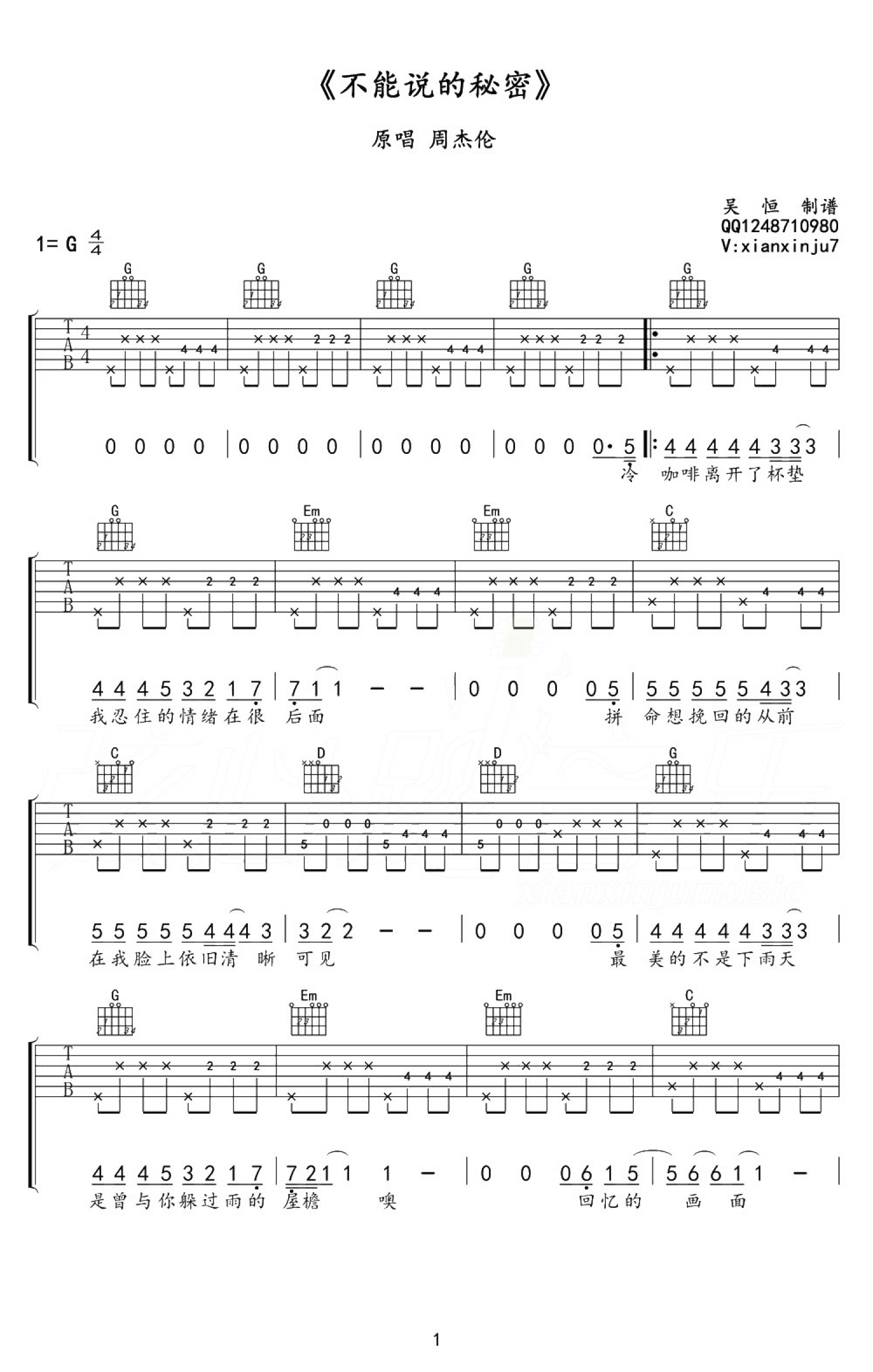 不能说的秘密吉他谱 - 周杰伦 - G调吉他弹唱谱