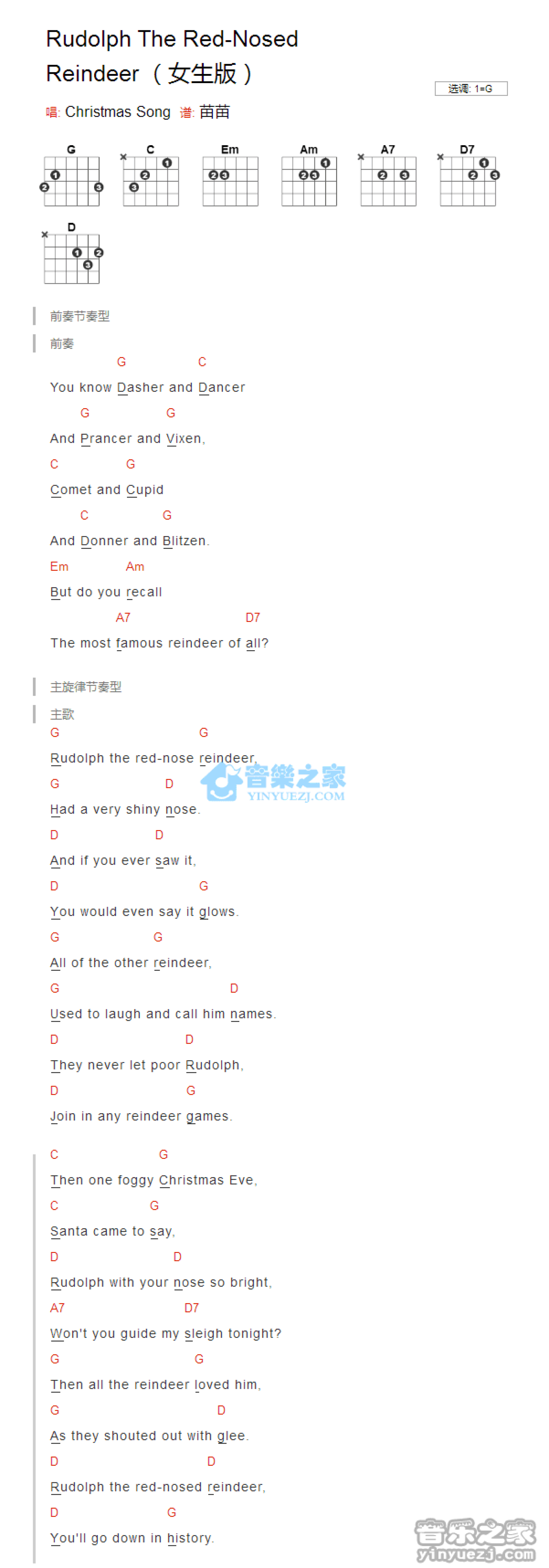 曲谱介绍: G调女生版《红鼻子驯鹿鲁道夫》吉他和弦弹唱谱