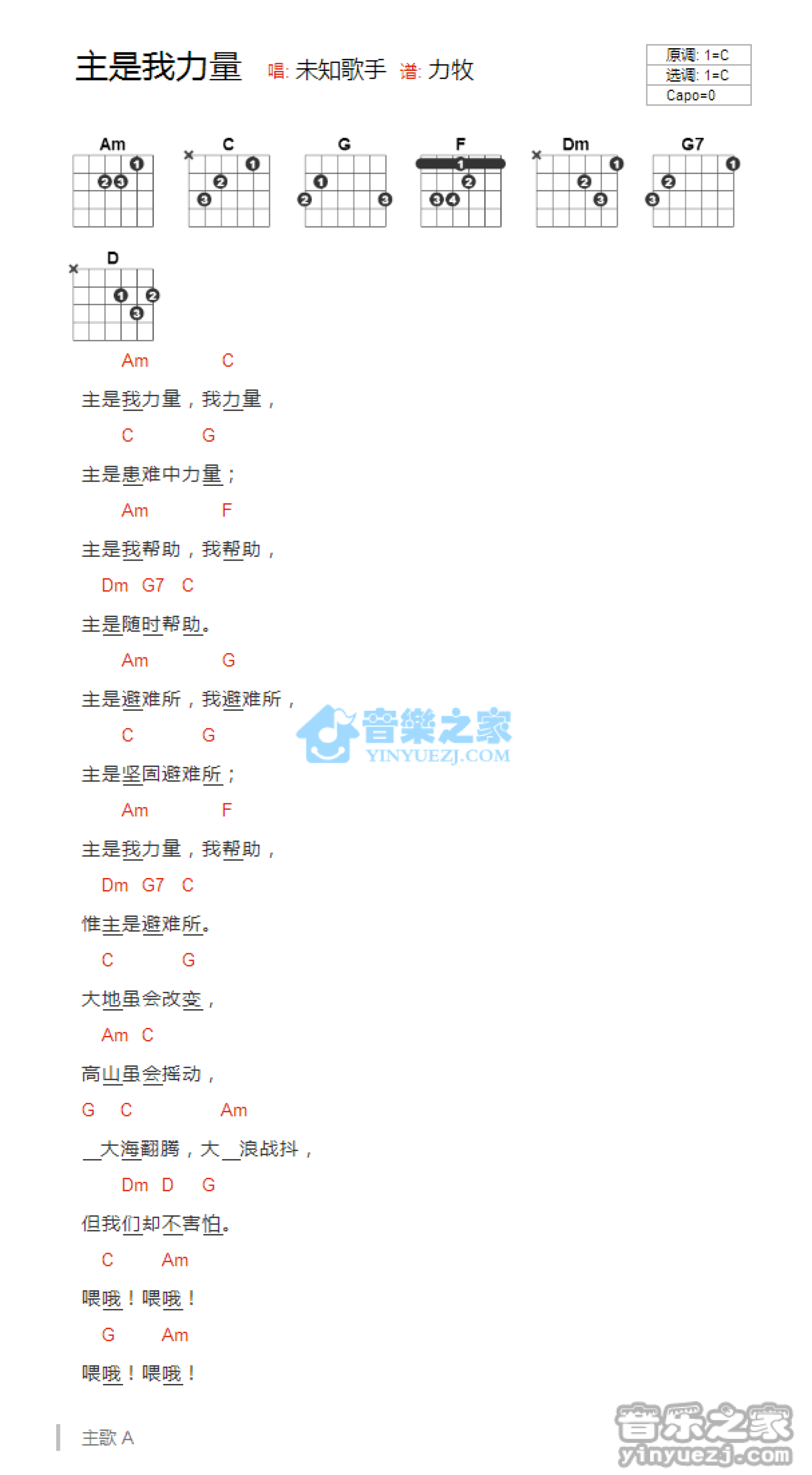 曲谱介绍: C调版 基督歌曲《主是我力量》吉他和弦弹唱谱