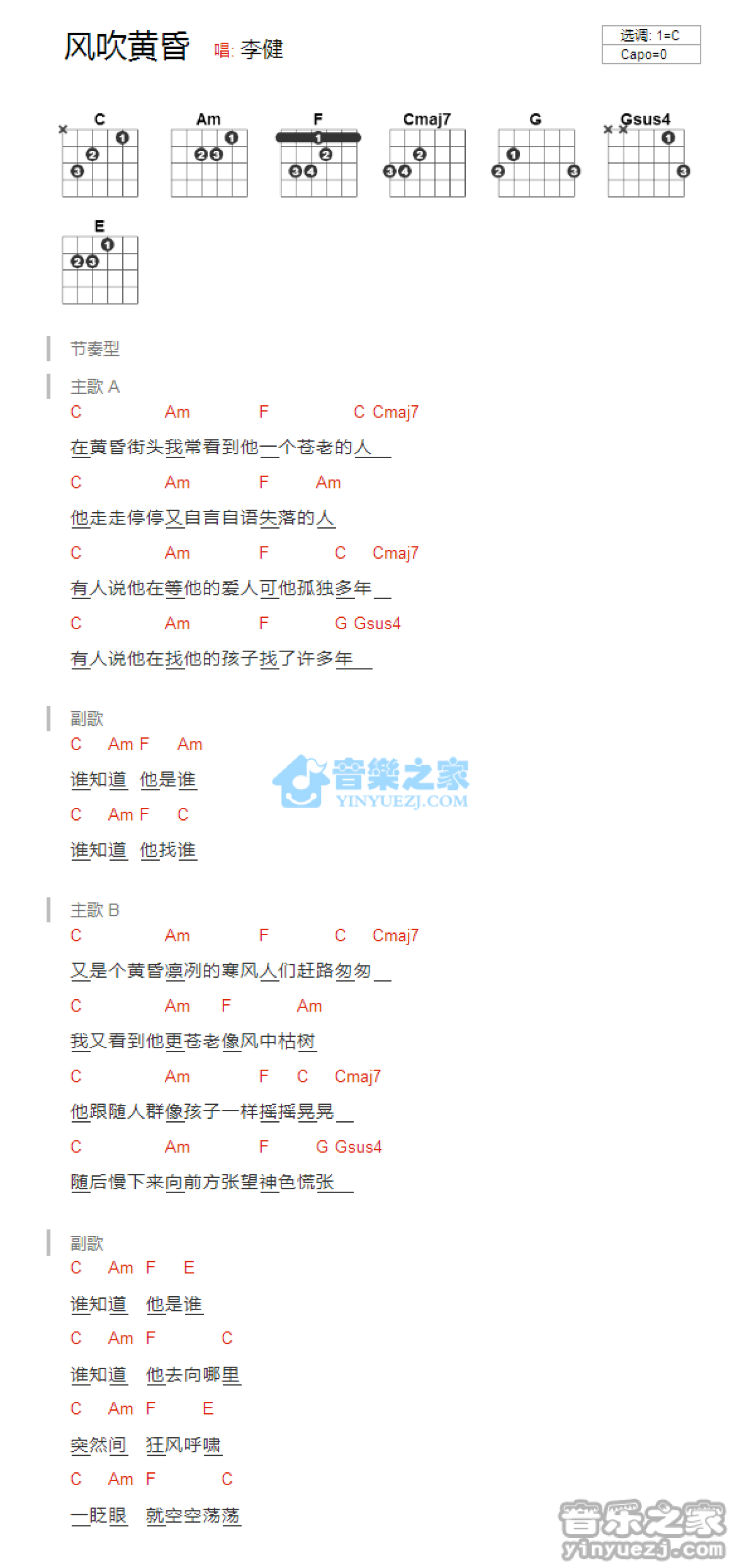 曲谱介绍: C调版李健《风吹黄昏》吉他和弦弹唱谱