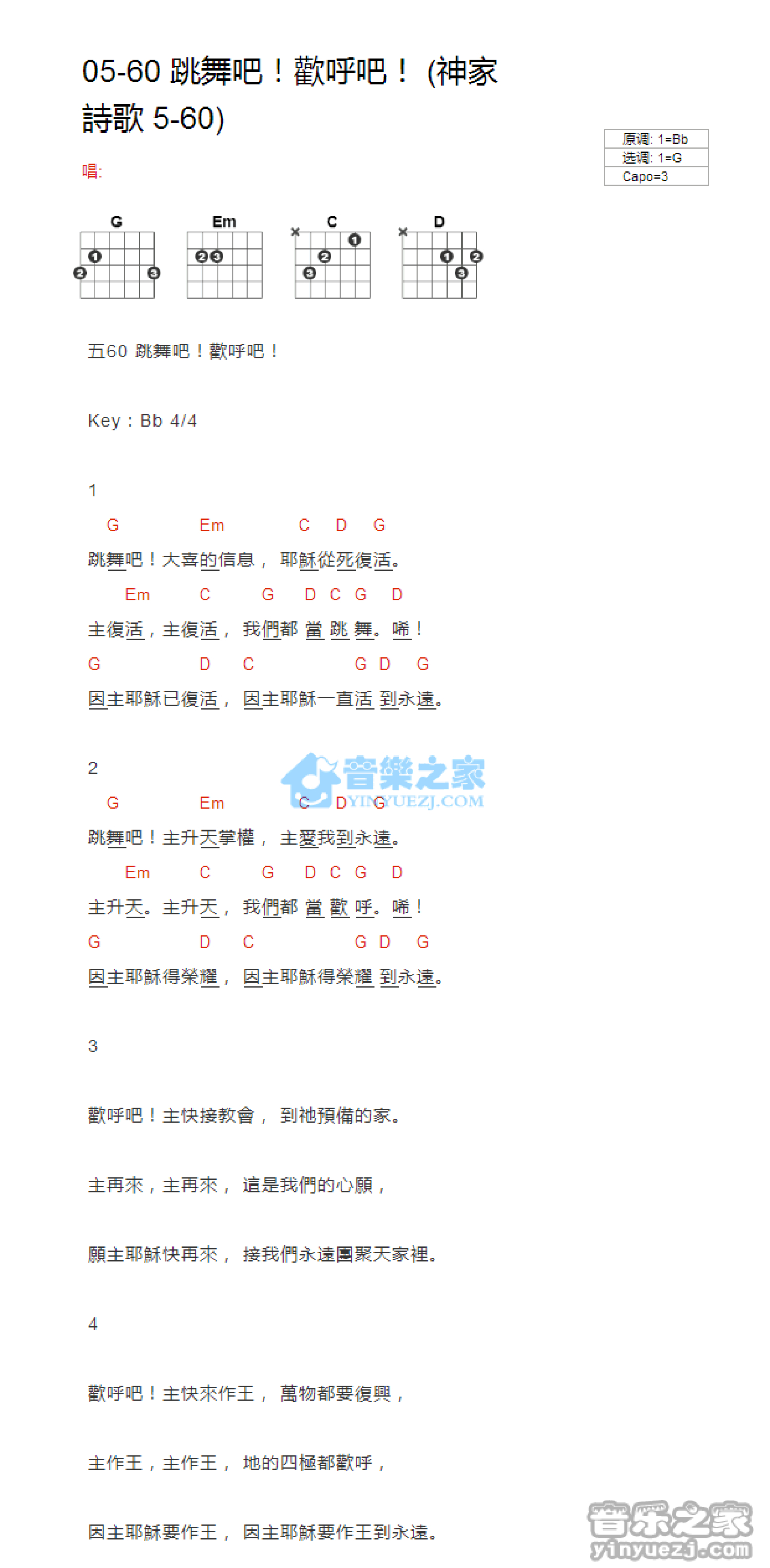 曲谱介绍: G调版 神家诗歌05-60《跳舞吧欢呼吧》吉他和弦弹唱谱
