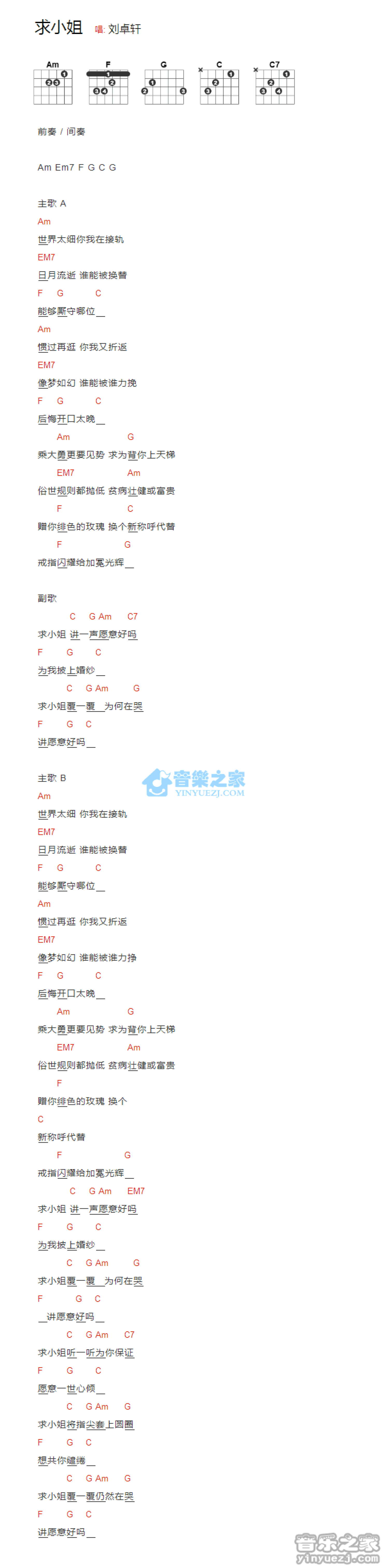 曲谱介绍: 刘卓轩《求小姐》吉他和弦弹唱谱