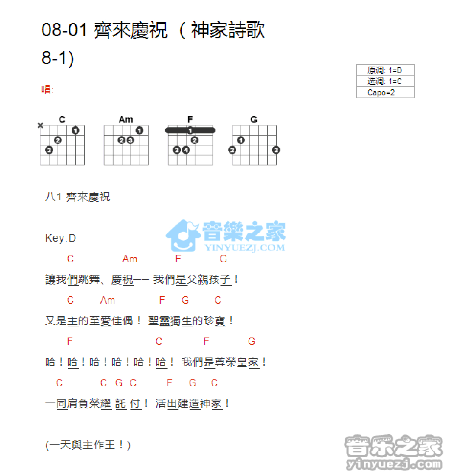 曲谱介绍: C调版 神家诗歌08-01《齐来庆祝》吉他和弦弹唱谱