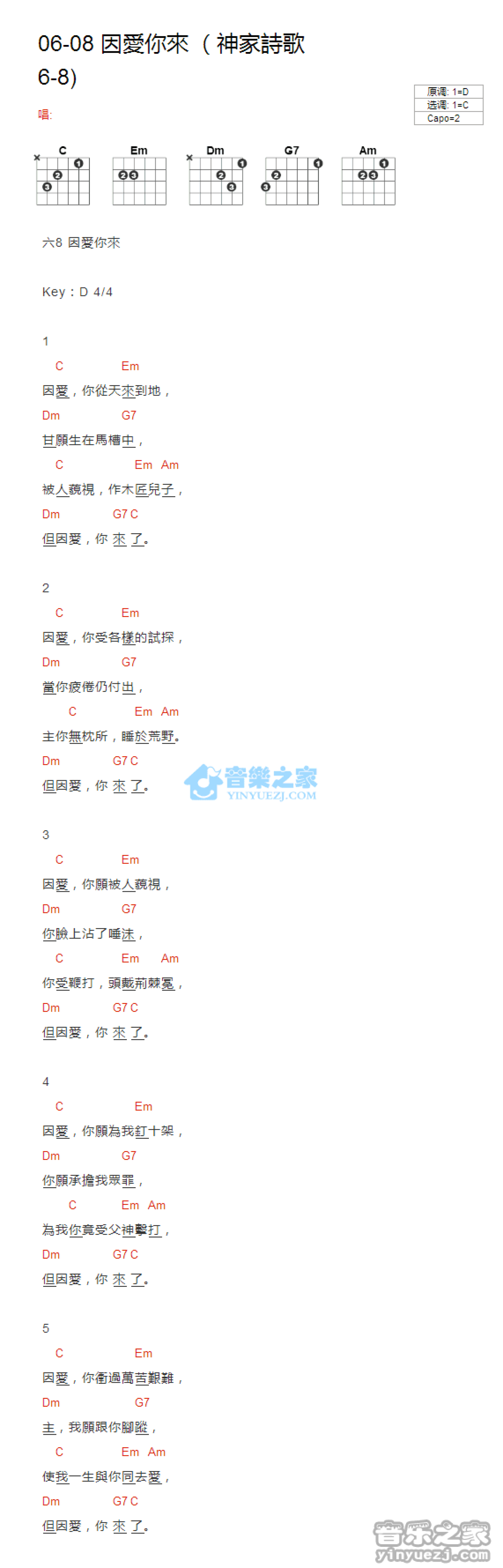 曲谱介绍: C调版 神家诗歌06-08《因爱你来》吉他和弦弹唱谱