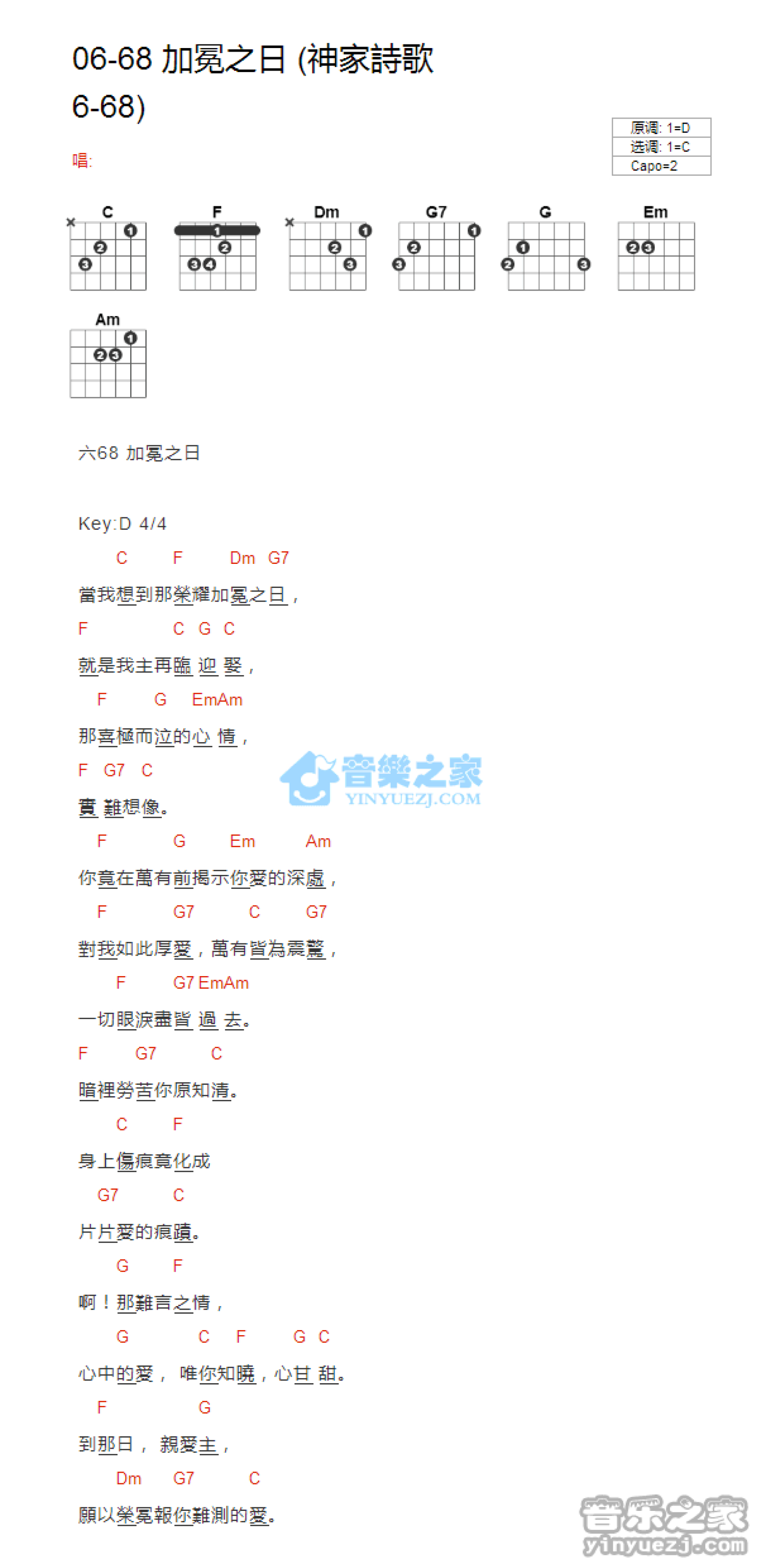 曲谱介绍: C调版 神家诗歌06-68《加冕之日》吉他和弦弹唱谱