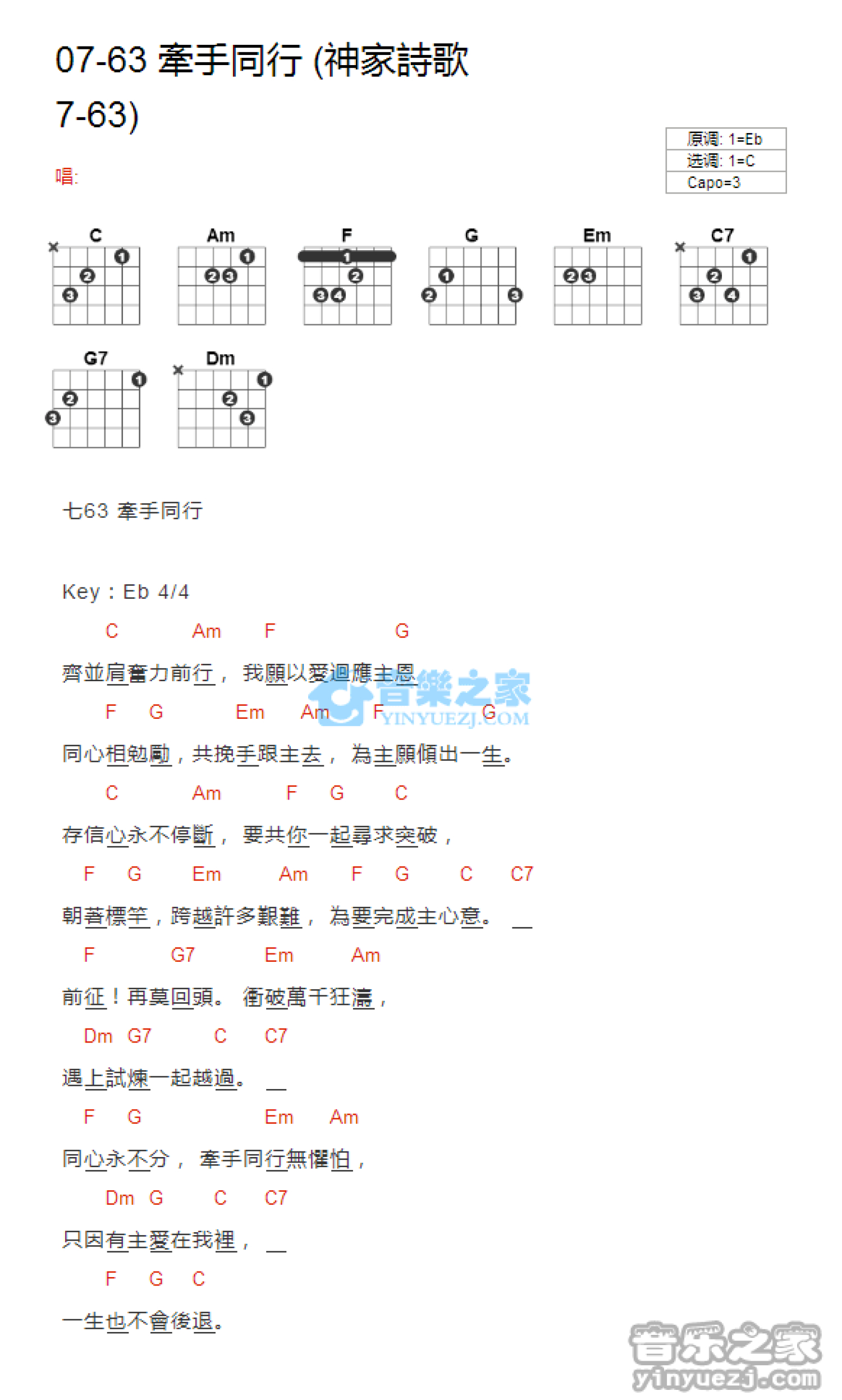 曲谱介绍: C调版07-63《牵手同行》吉他和弦弹唱谱