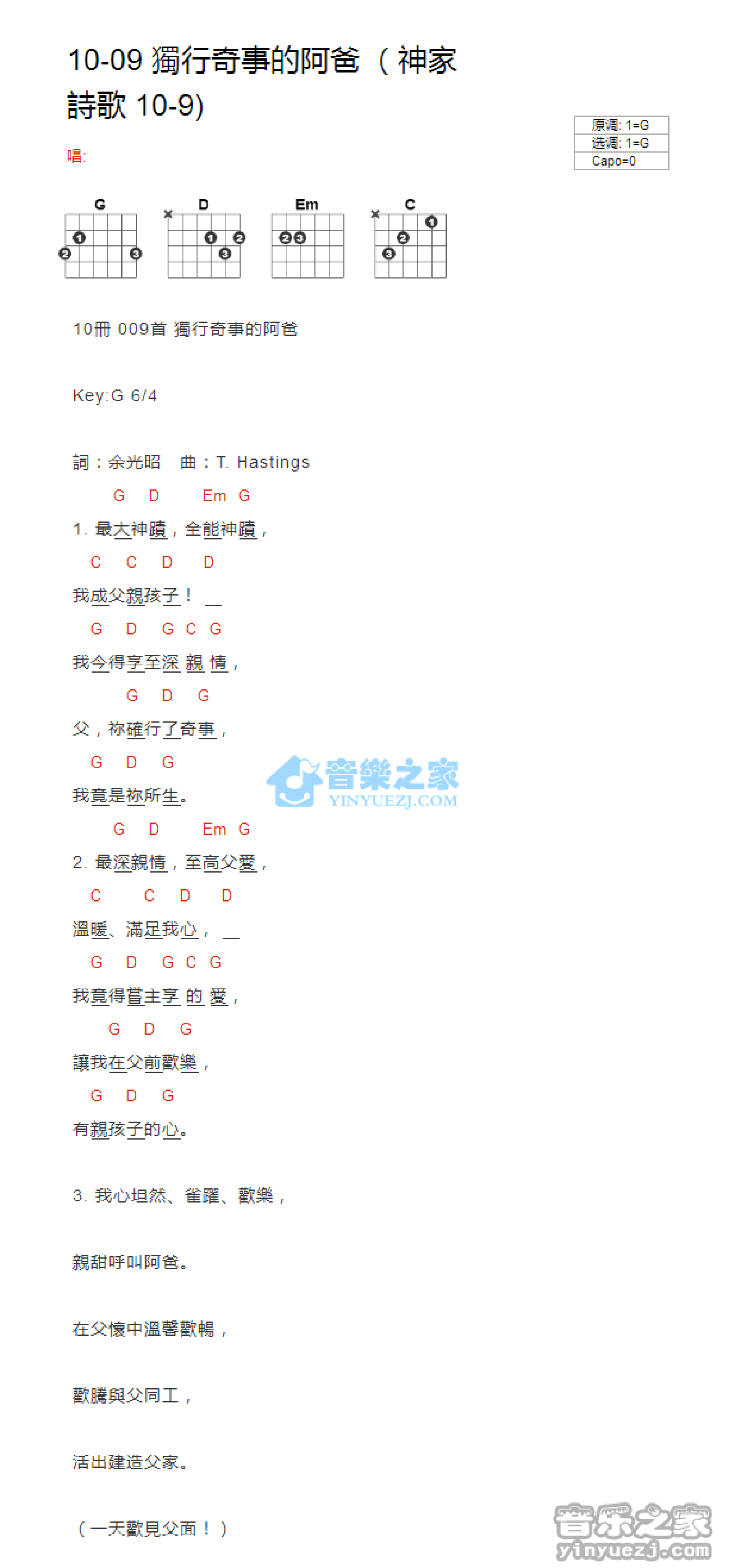 曲谱介绍: G调版10-09《独行奇事的阿爸》吉他和弦弹唱谱