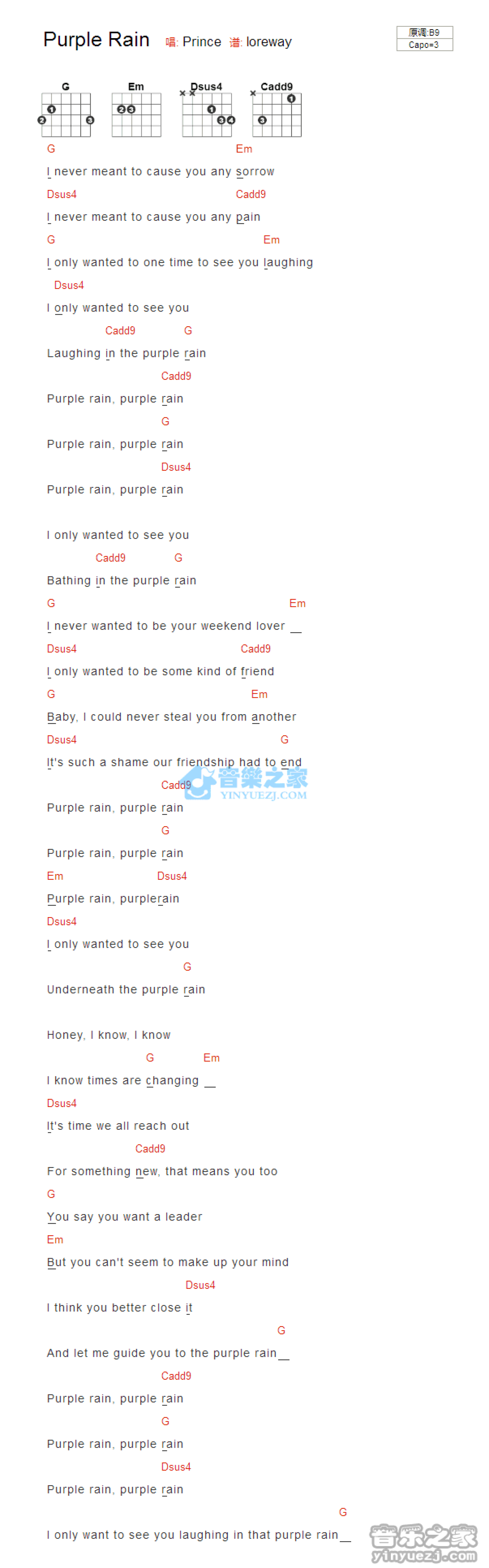 曲谱介绍: Prince《Purple Rain》吉他和弦弹唱谱