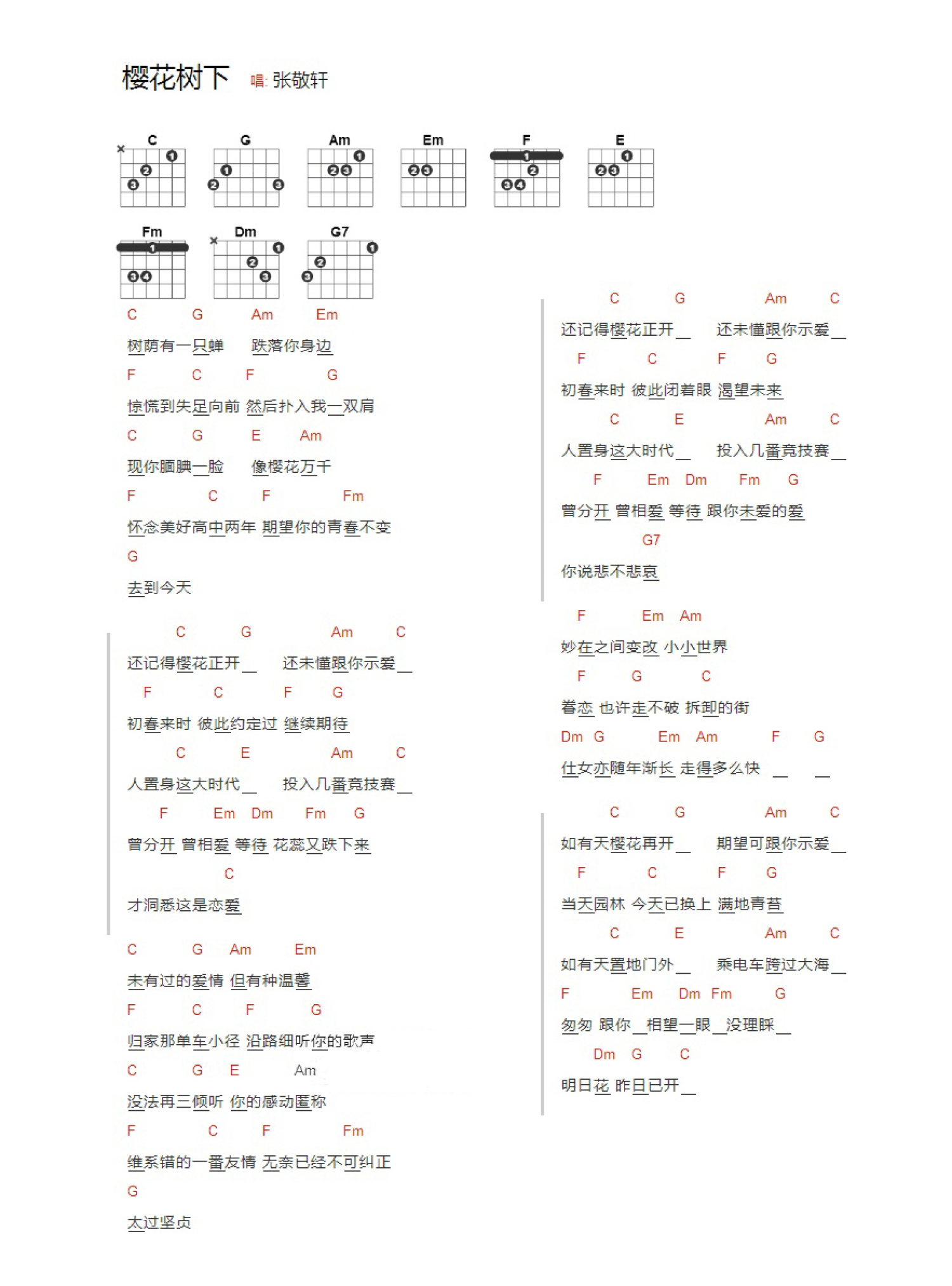 樱花树下吉他谱 - 张敬轩 - 吉他弹唱谱 - 和弦谱