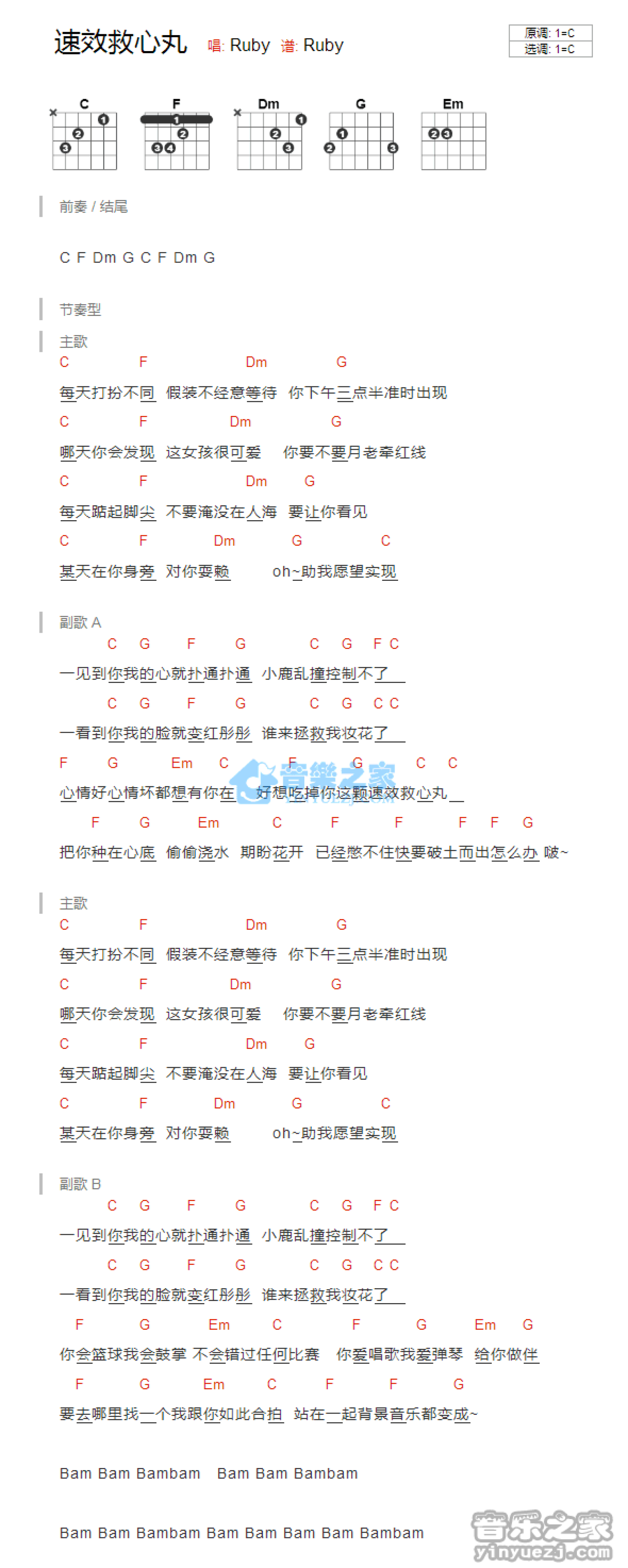 曲谱介绍: C调版 Ruby《速效救心丸》吉他和弦弹唱谱