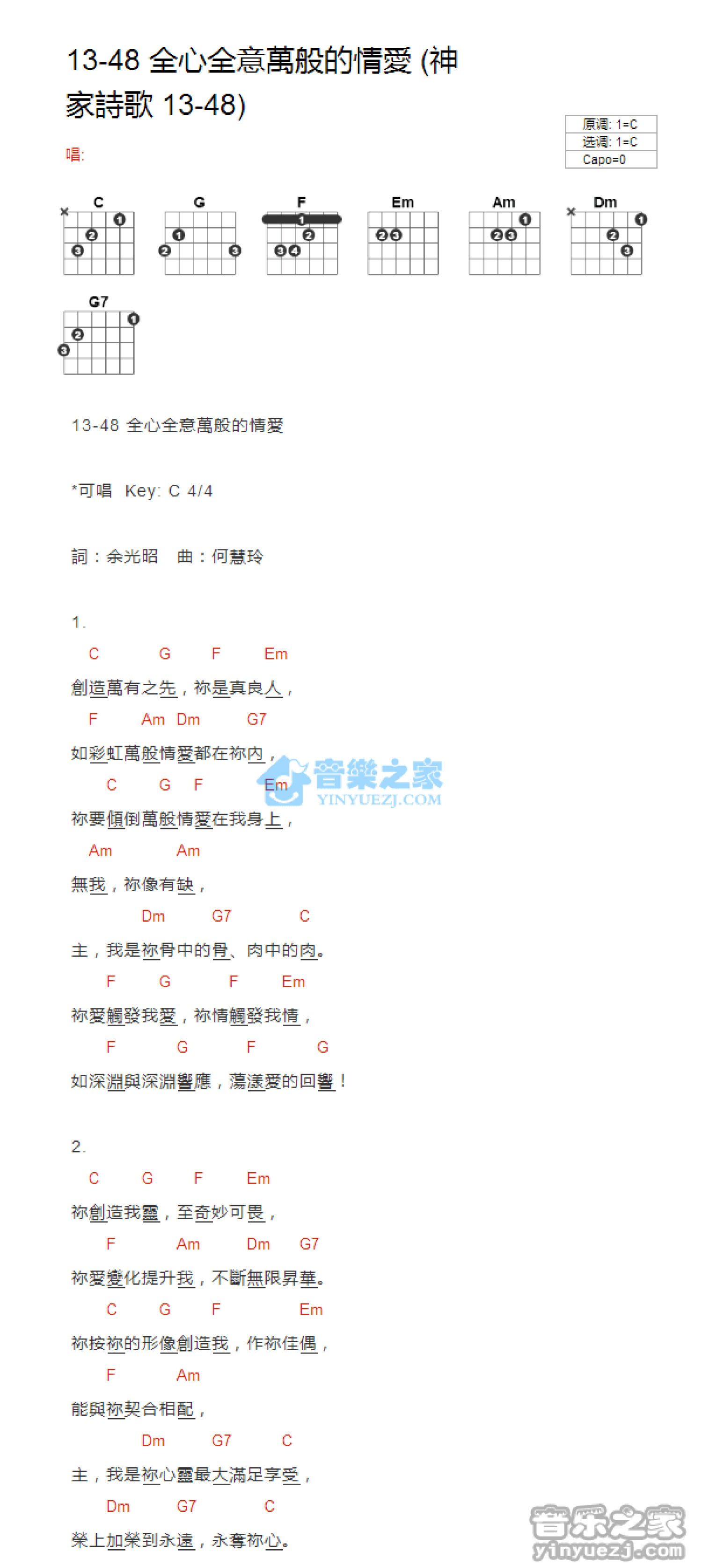 曲谱介绍: C调版 神家诗歌13-48《全心全意万般的情爱》吉他和弦弹唱谱