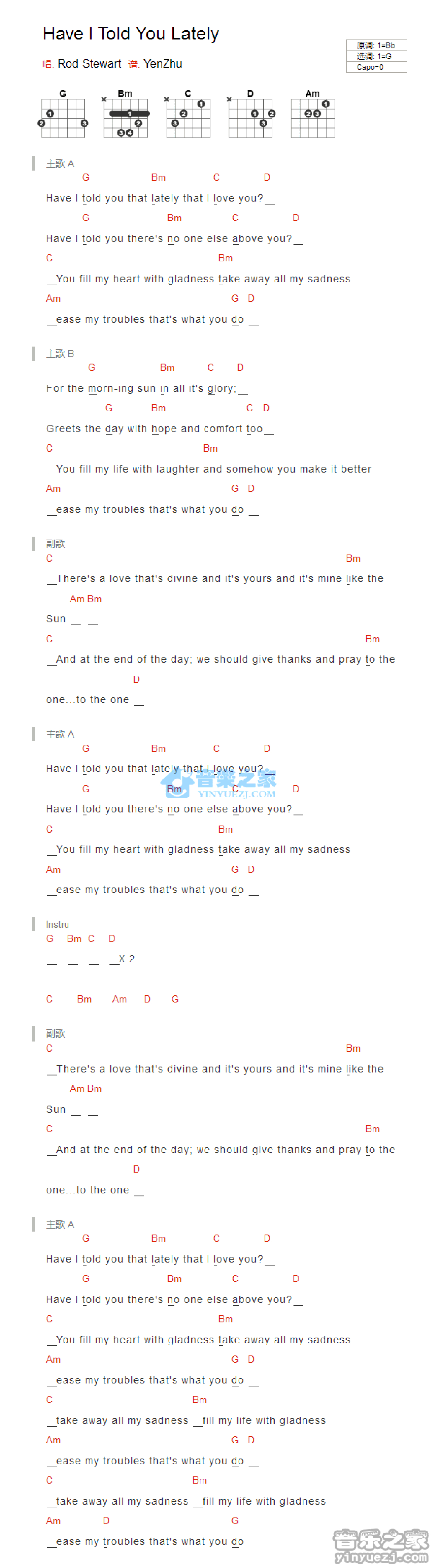 曲谱介绍: G调版 Rod Stewart《Have I Told You Lately》吉他和弦弹唱谱