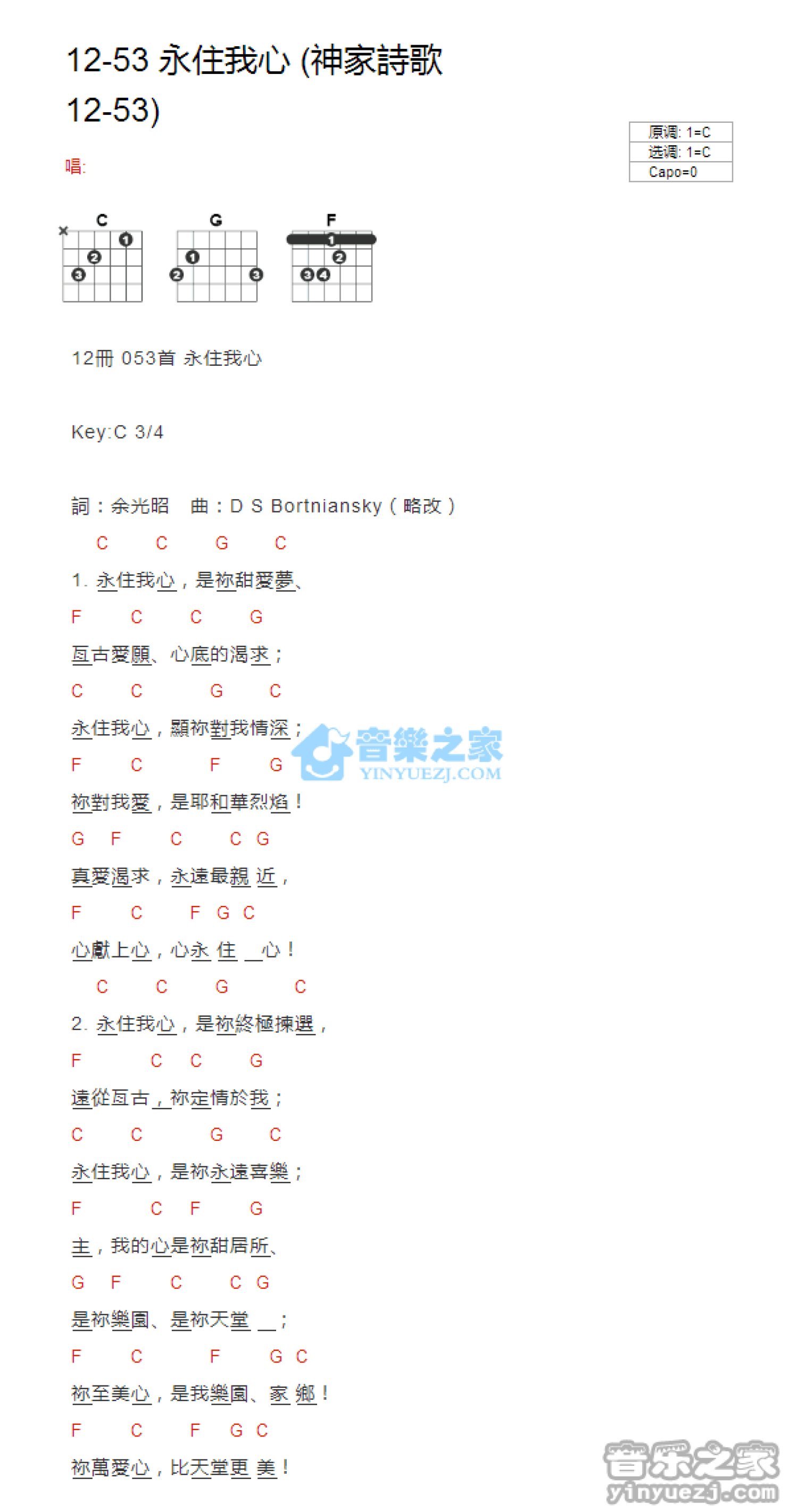 曲谱介绍: C调版 神家诗歌12-53《永住我心》吉他和弦弹唱谱