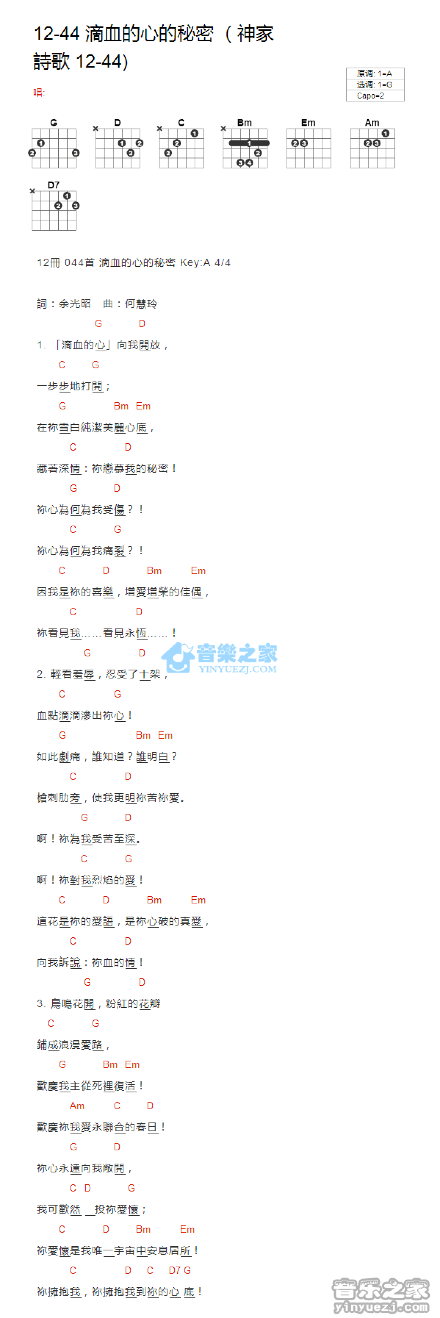 曲谱介绍: G调版 神家诗歌12-44《滴血的心的秘密》吉他和弦弹唱谱