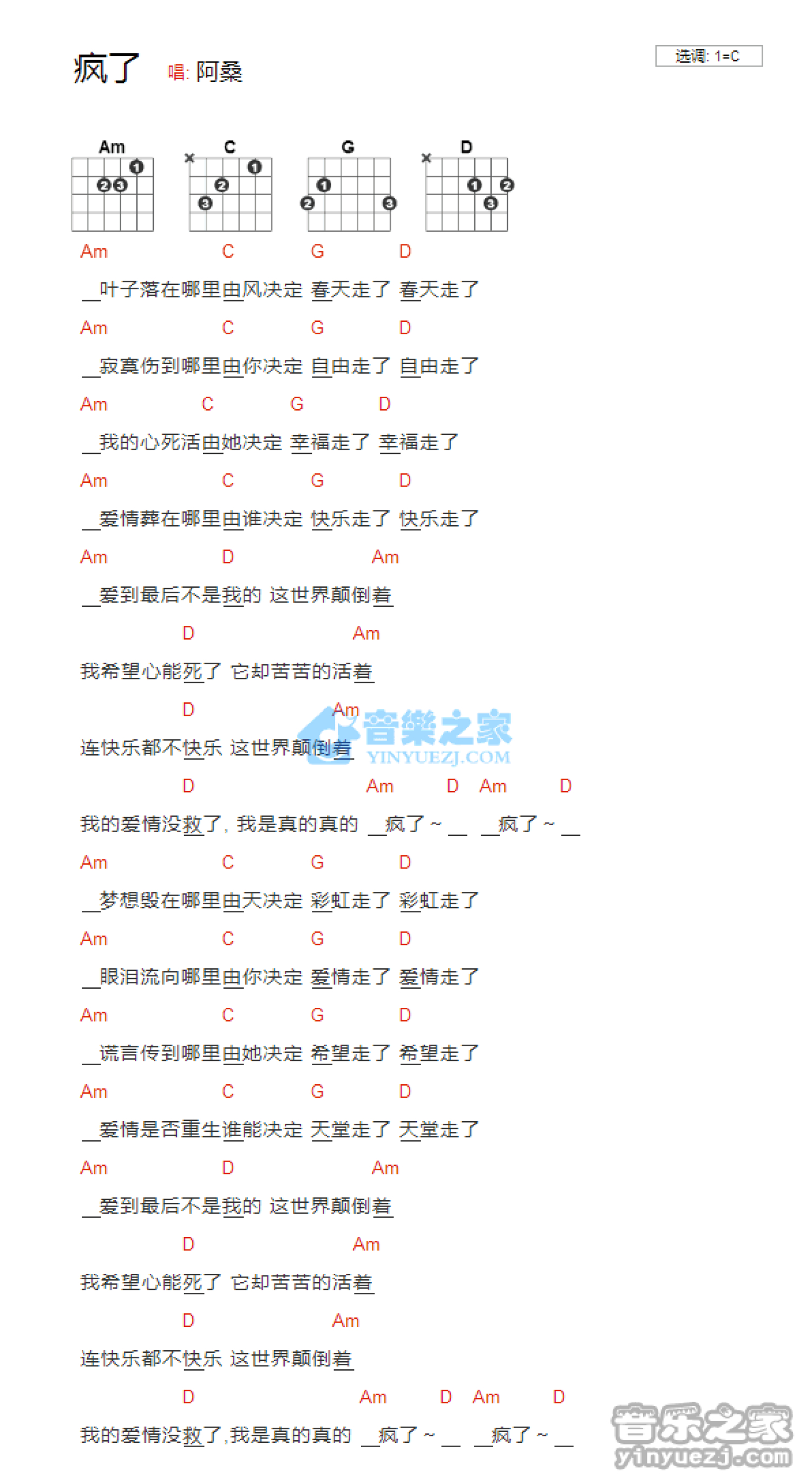 曲谱介绍: C调版 阿桑《疯了》吉他和弦弹唱谱