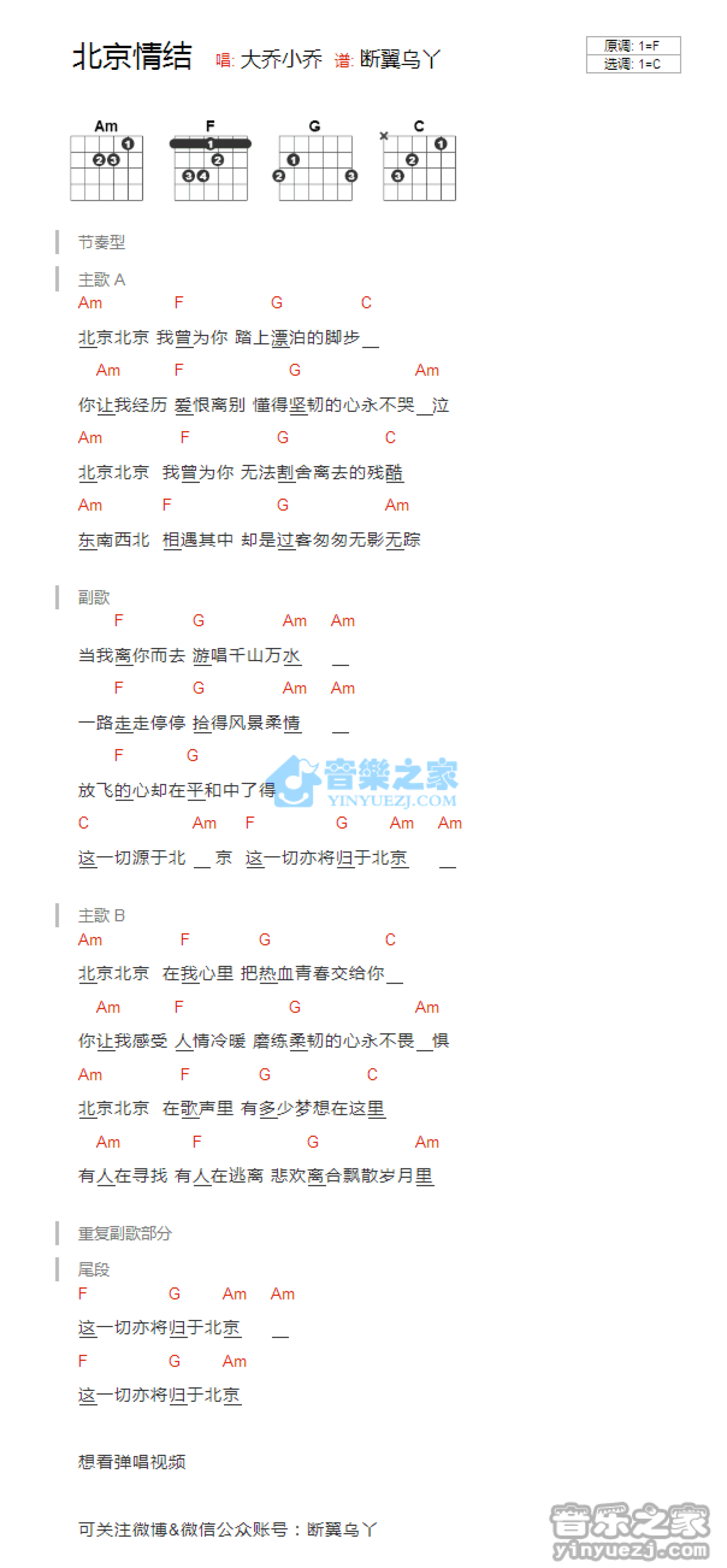 曲谱介绍: C调版 大乔小乔《北京情结》吉他和弦弹唱谱