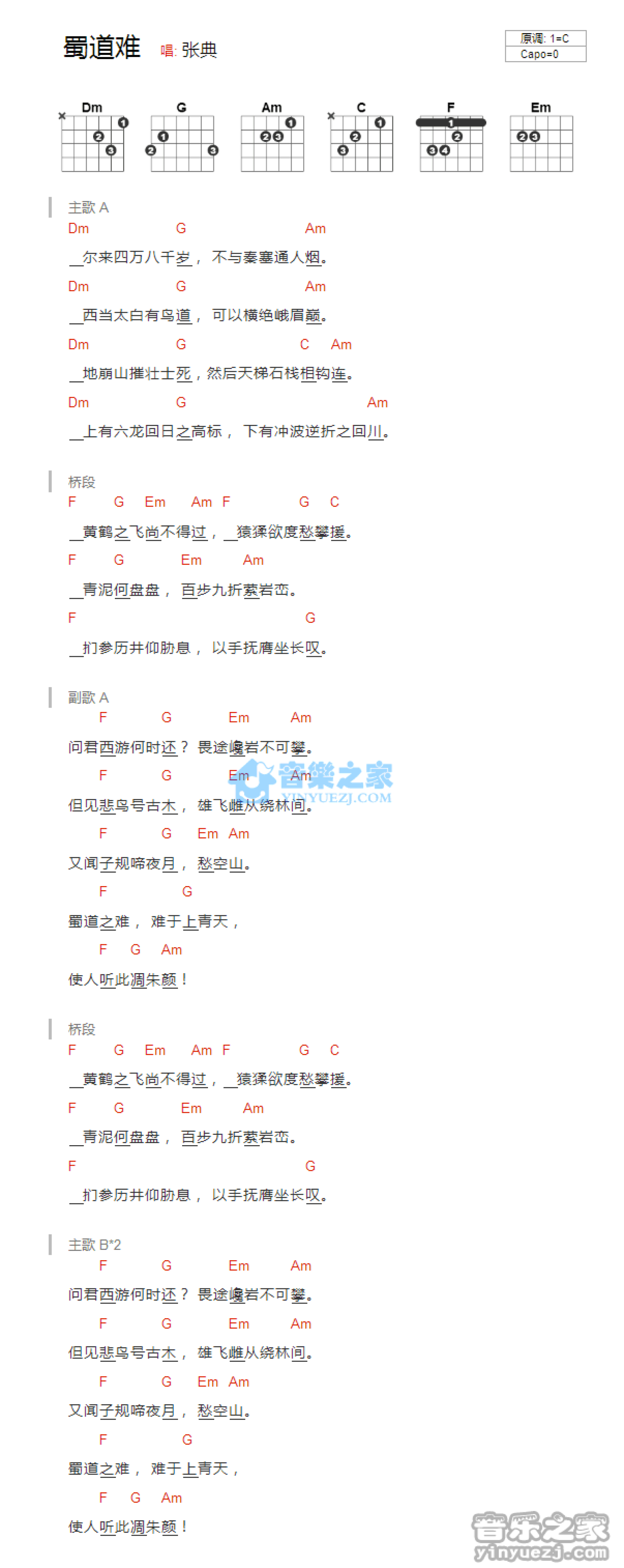 曲谱介绍: C调版 张典《蜀道难》吉他和弦弹唱谱