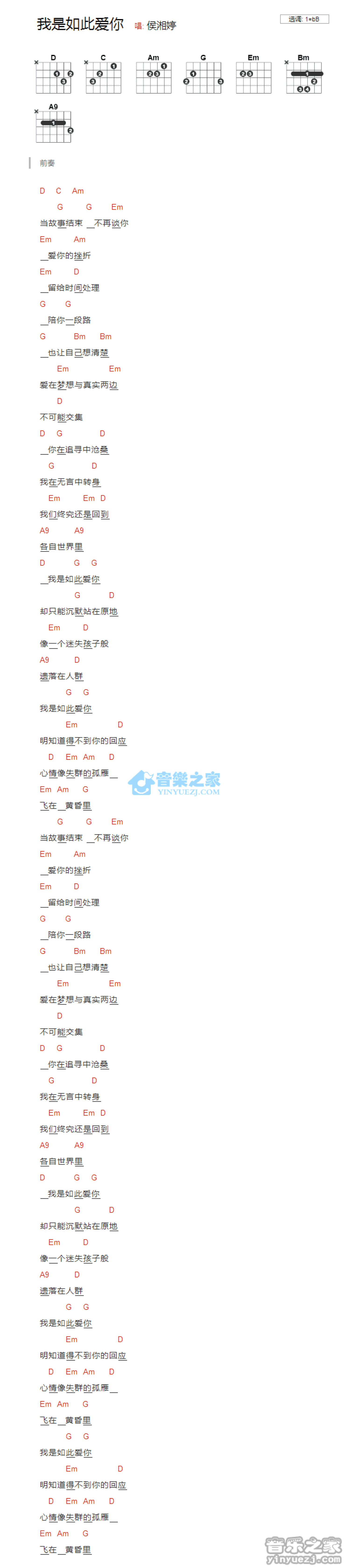 曲谱介绍: bB调版 侯湘婷《我是如此爱你》吉他和弦弹唱谱