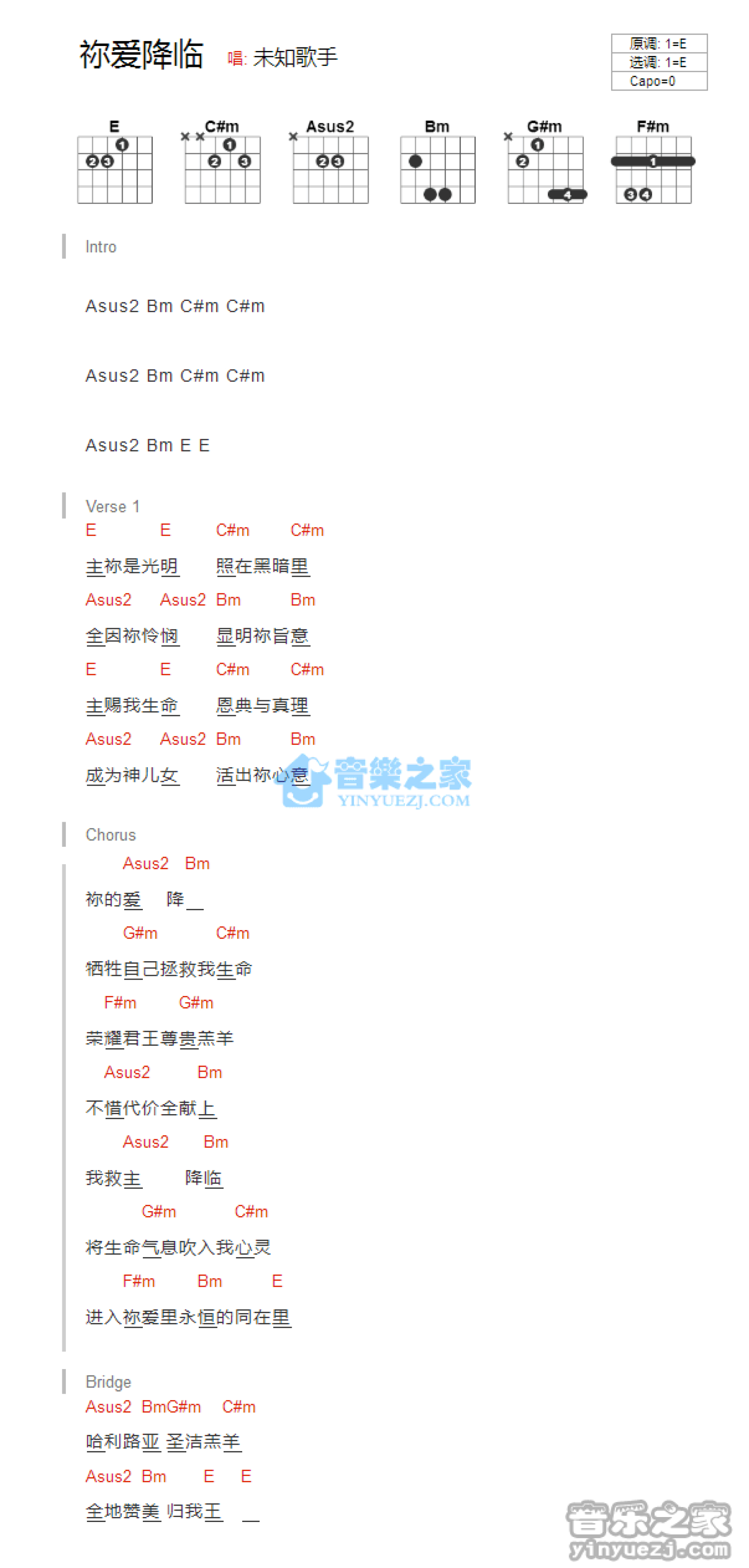 曲谱介绍: E调版 Jesus Fashion《你爱降临》吉他和弦弹唱谱