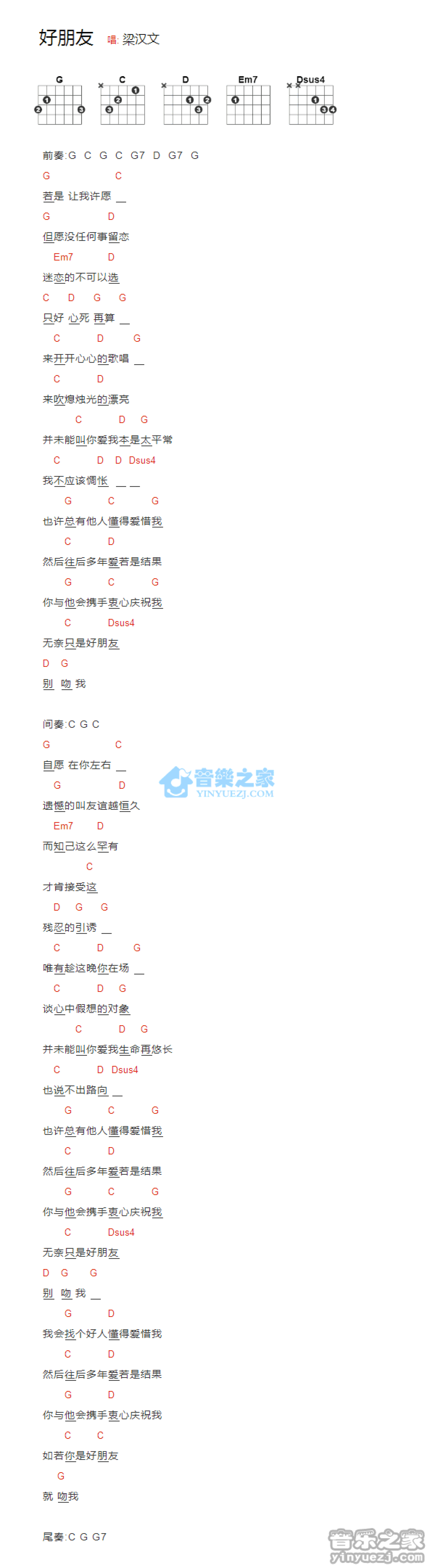 曲谱介绍: 梁汉文《好朋友》吉他和弦弹唱谱