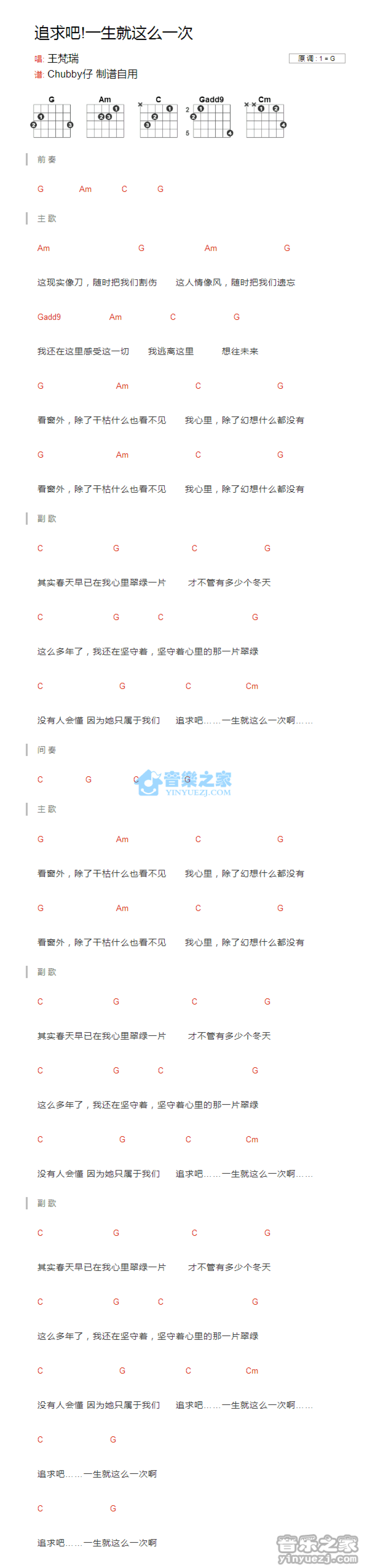 曲谱介绍: G调版 王梵瑞《追求吧一生就这么一次》吉他和弦弹唱谱