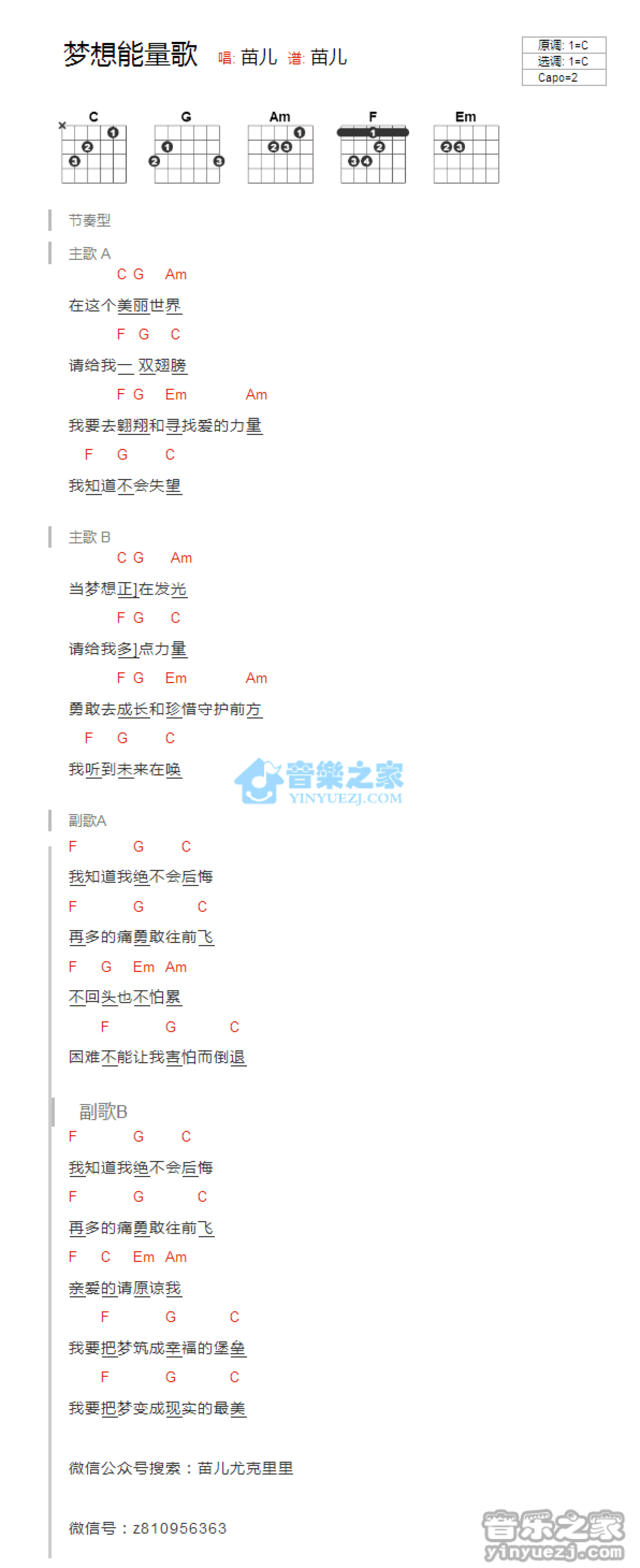 曲谱介绍: C调版 苗儿《梦想能量歌》吉他和弦弹唱谱