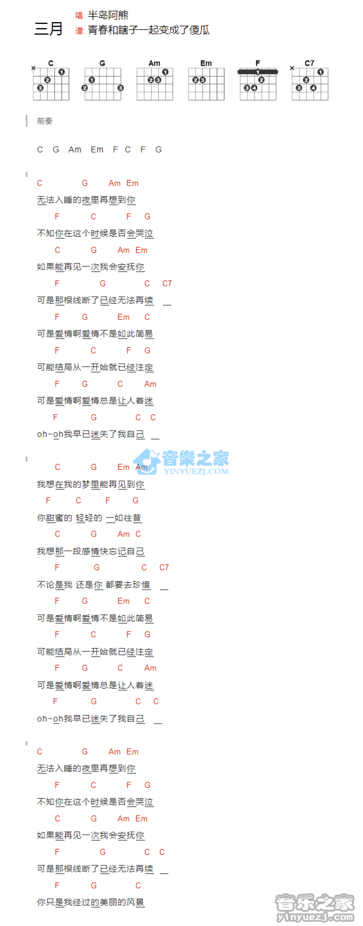 曲谱介绍: 半岛阿熊《三月》吉他和弦弹唱谱