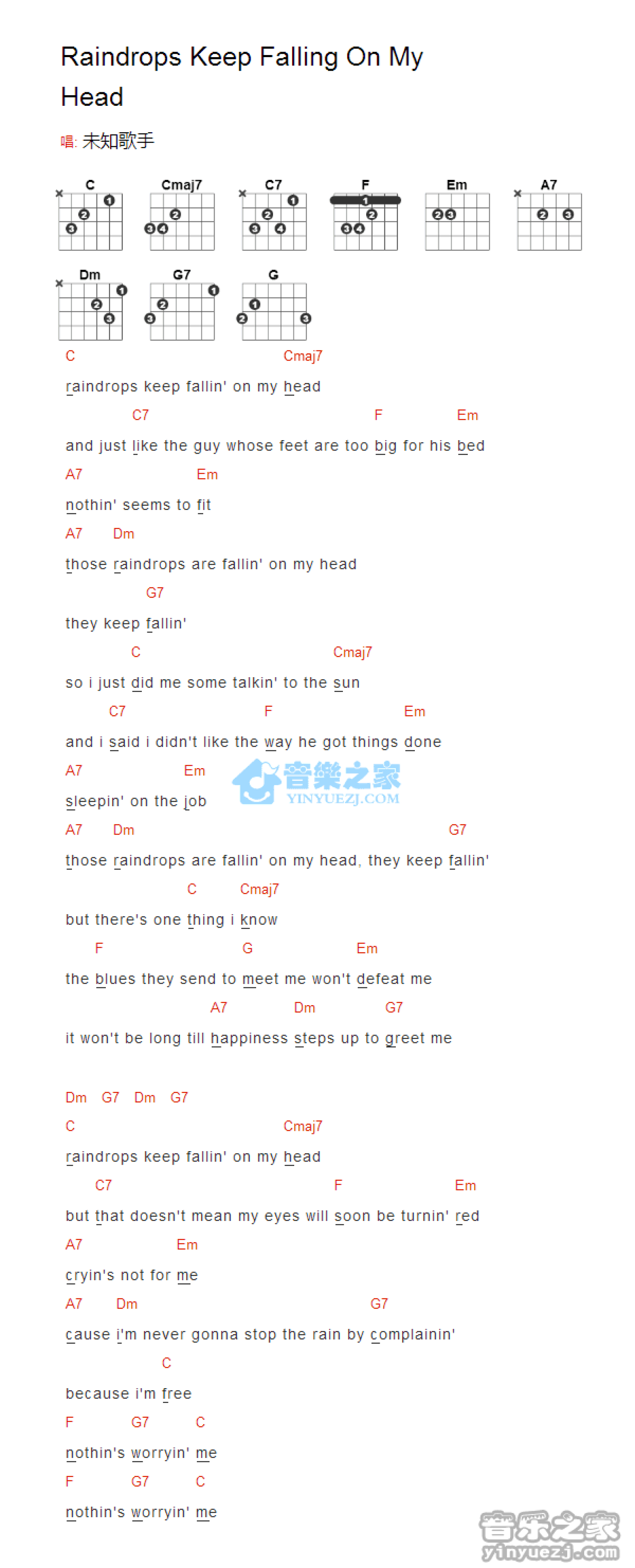 Raindrops Keep Falling On My Head吉他谱 - 未知歌手 - 吉他弹唱谱 - 和弦谱