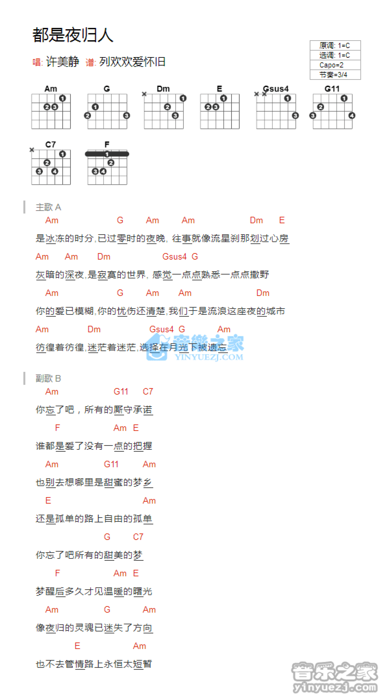 曲谱介绍: C调版 许美静《都是夜归人》吉他和弦弹唱谱
