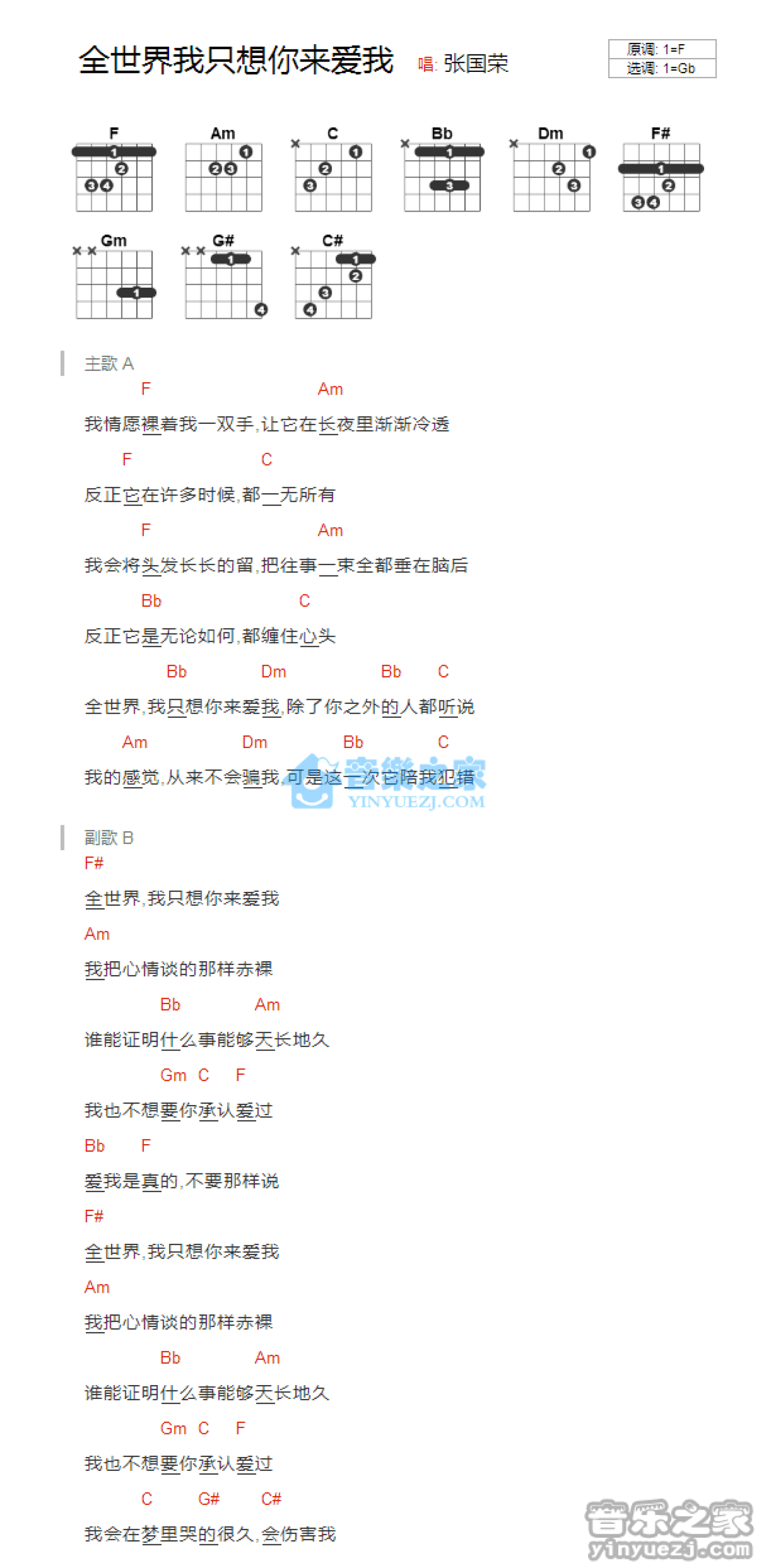 曲谱介绍: bG调版 张国荣《全世界我只想你来爱我》吉他和弦弹唱谱