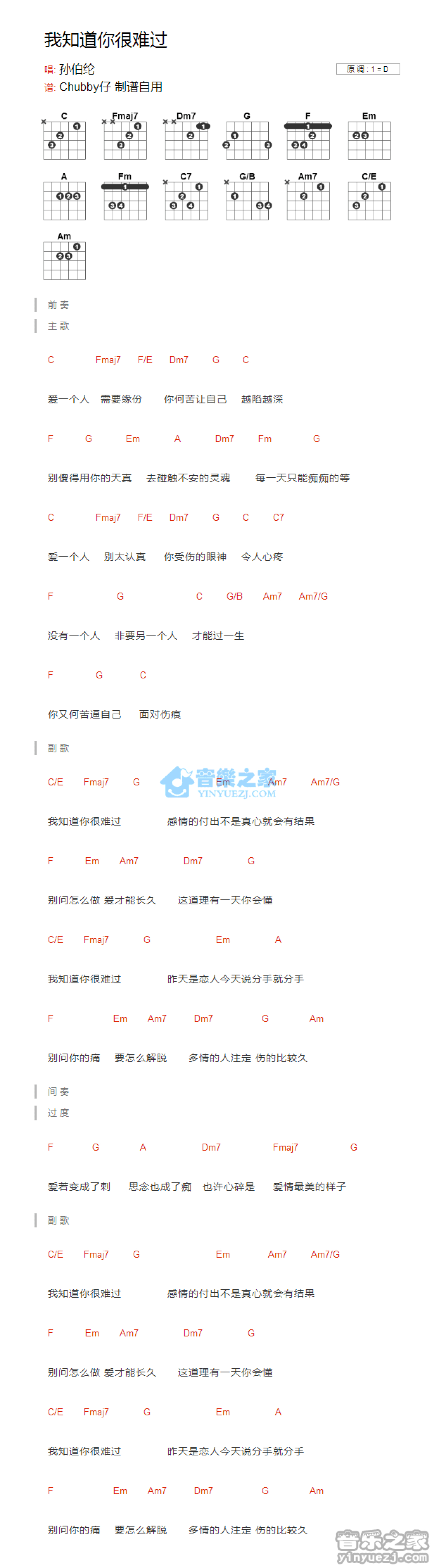 我知道你很难过吉他谱 - 孙伯伦 - D调吉他弹唱谱 - 和弦谱