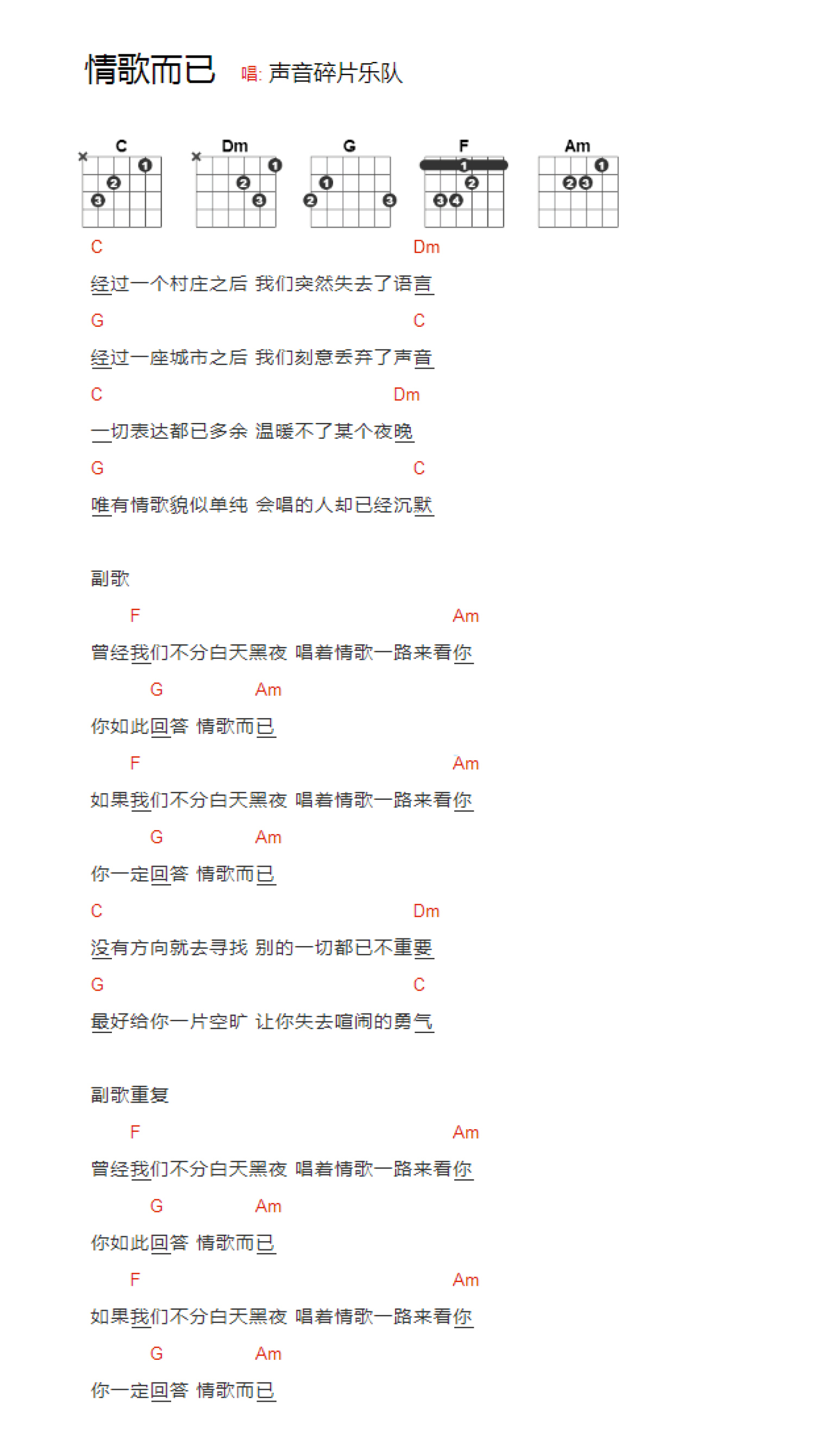 曲谱介绍: 声音碎片《情歌而已》吉他和弦弹唱谱