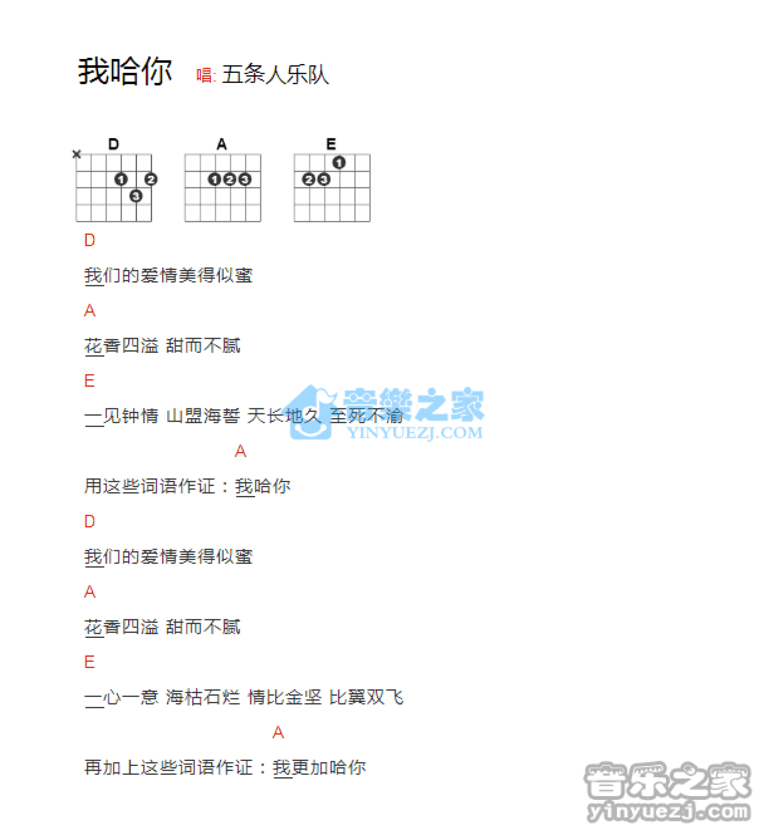 曲谱介绍: 五条人《我哈你》吉他和弦弹唱谱