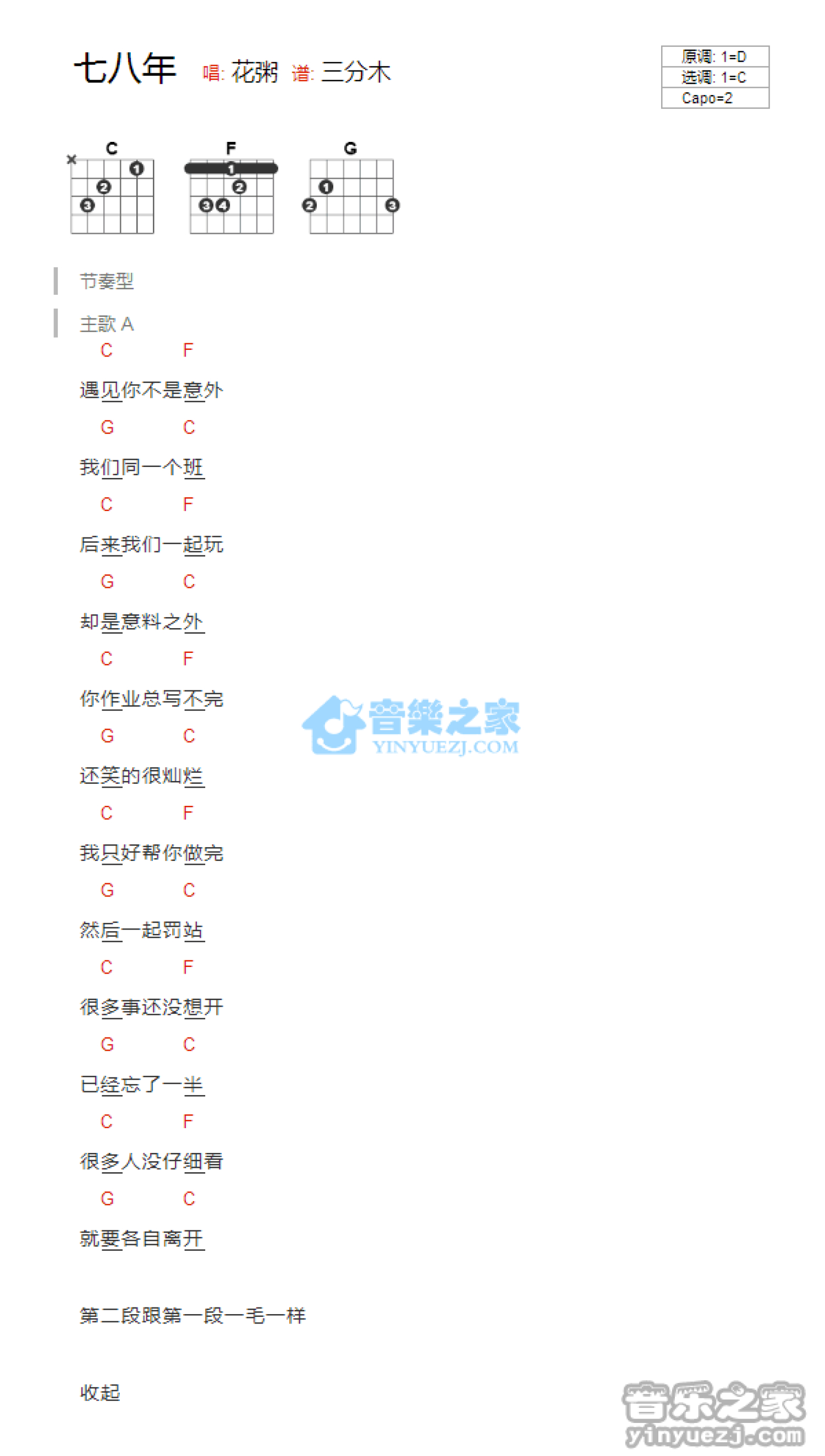 曲谱介绍: C调版《七八年》吉他和弦弹唱谱
