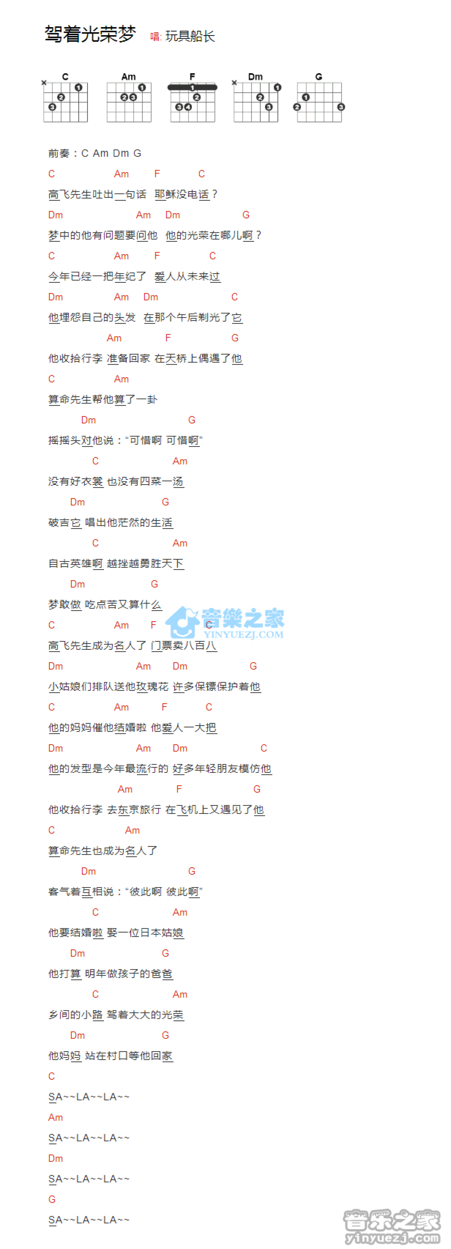 曲谱介绍: 玩具船长《驾着光荣梦》吉他和弦弹唱谱