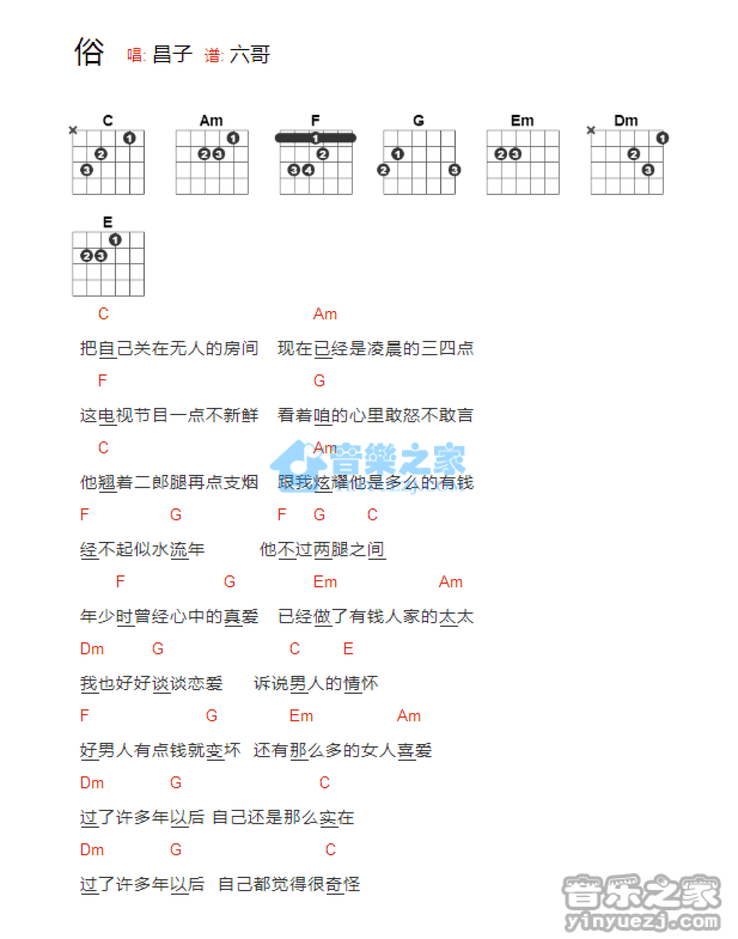 曲谱介绍: 昌子《俗》吉他和弦弹唱谱