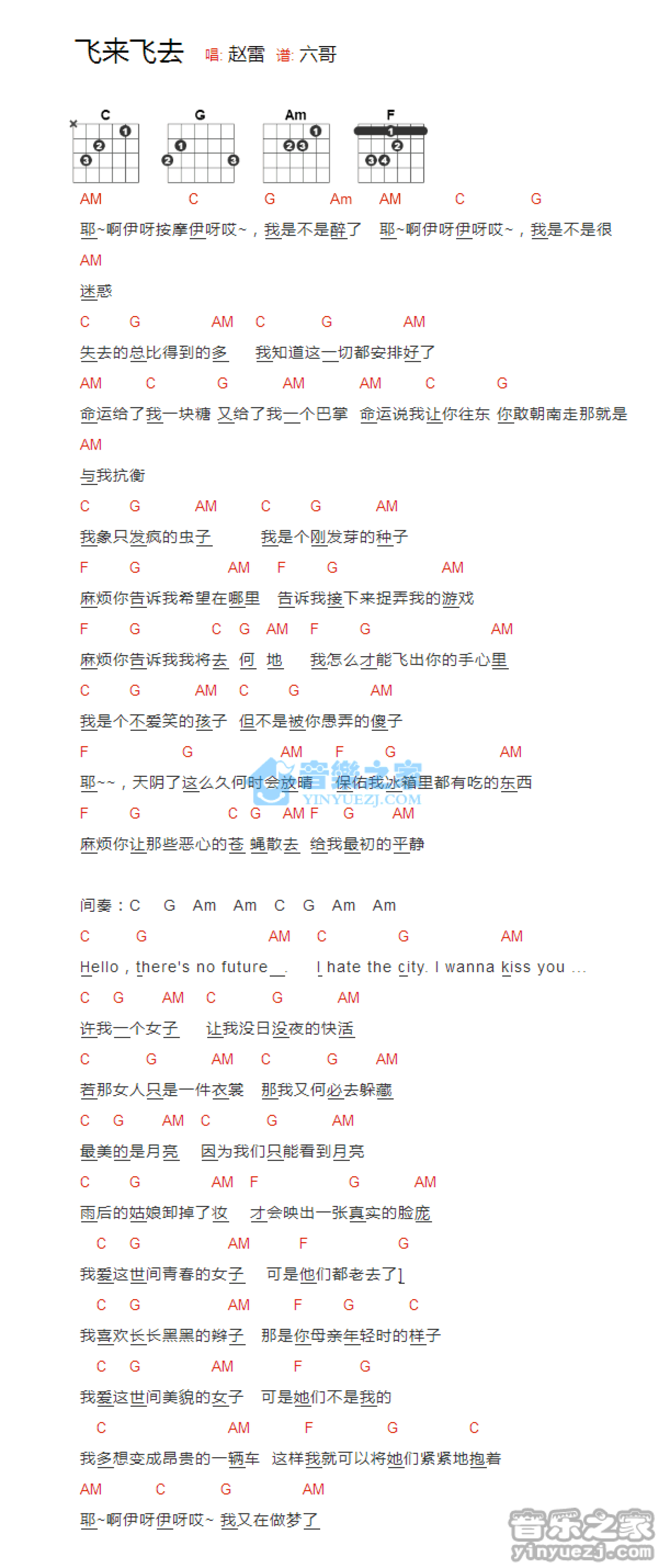 曲谱介绍: 赵雷《飞来飞去》吉他和弦弹唱谱