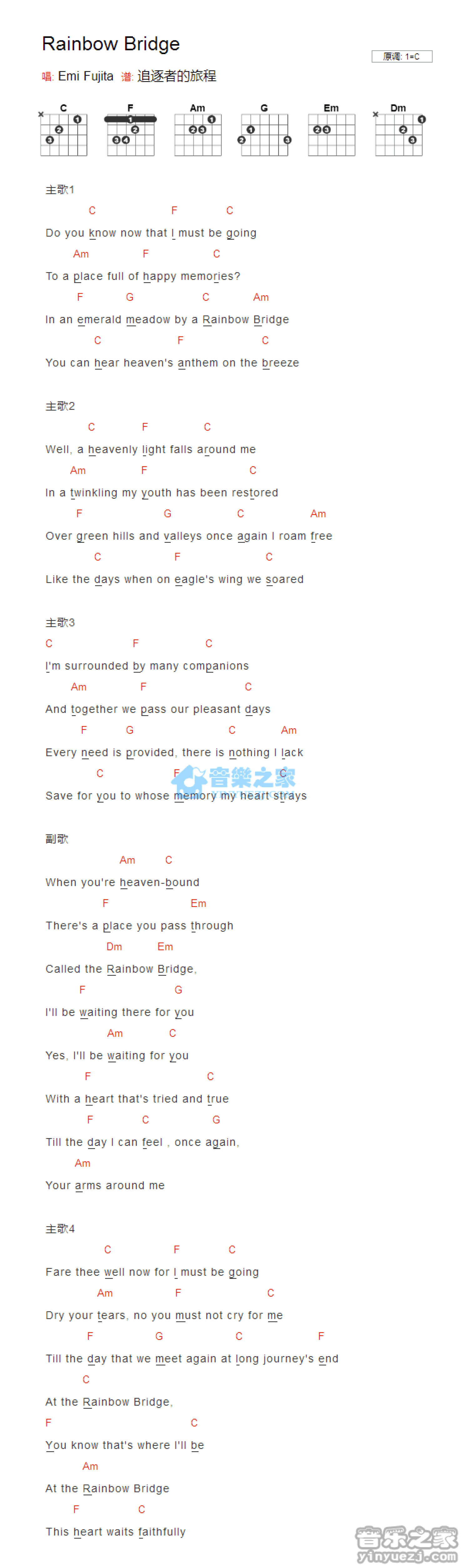 曲谱介绍: C调版 Emi Fujita《RainbowBridge》吉他和弦弹唱谱
