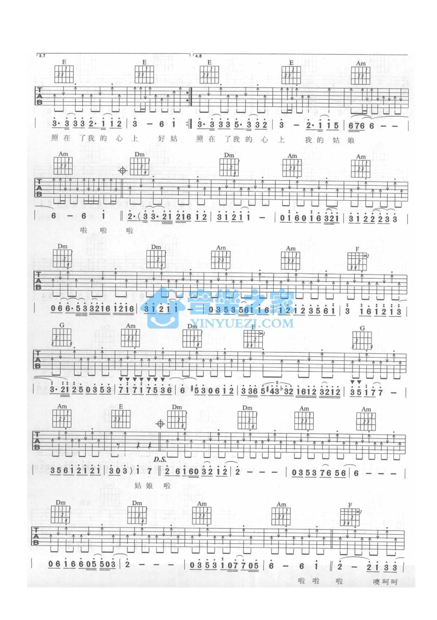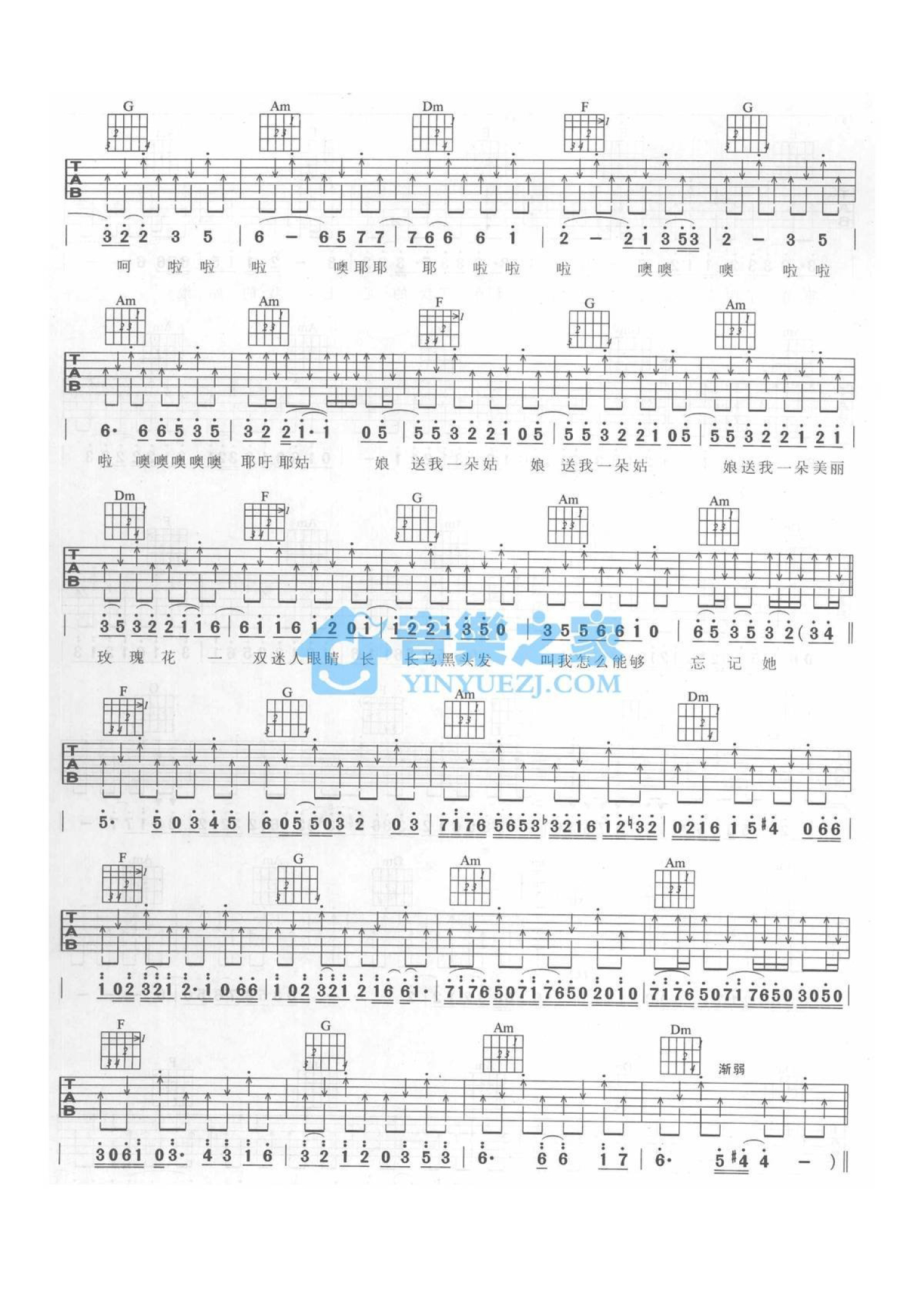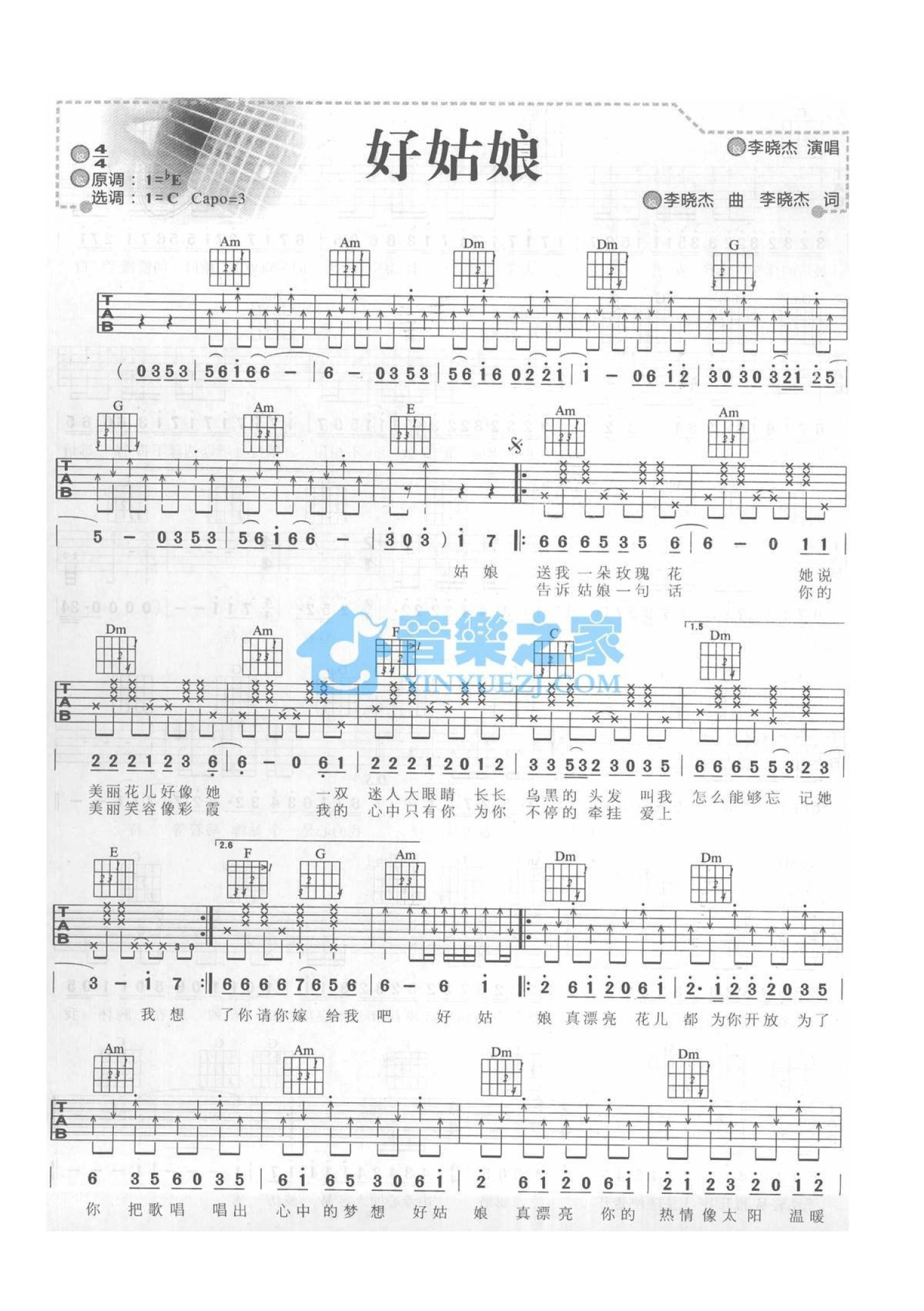 曲谱介绍: C调版《好姑娘》吉他弹唱六线谱