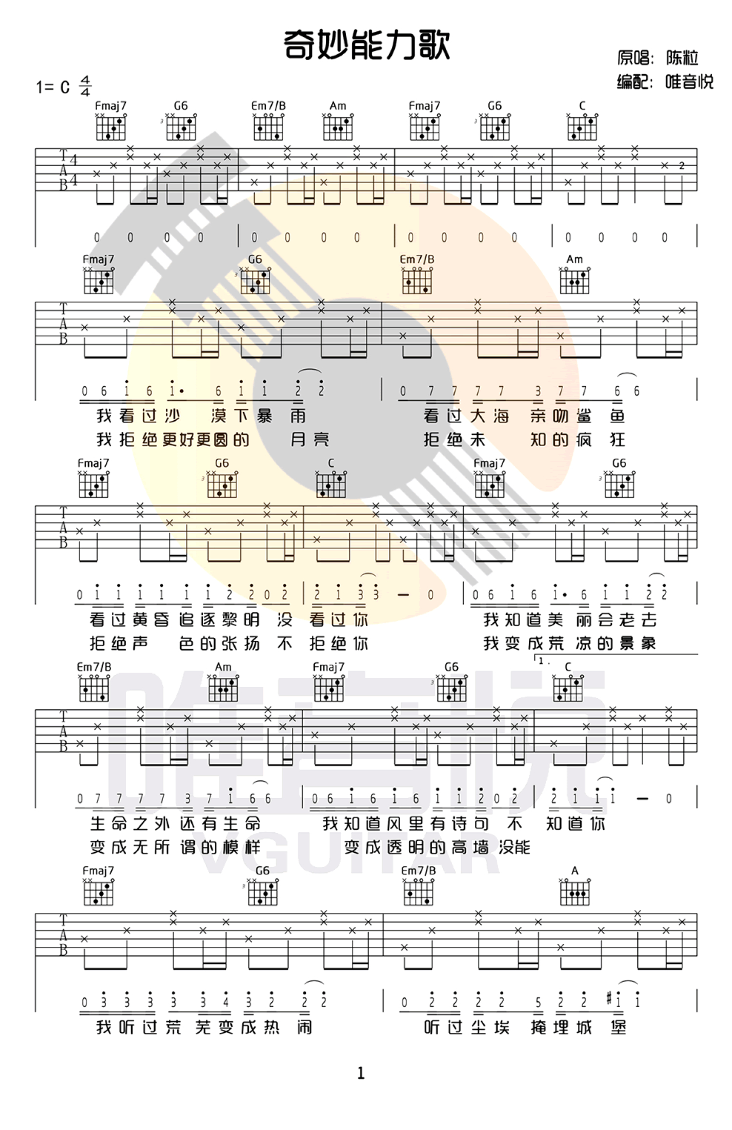 曲谱介绍: 陈粒演唱奇妙能力歌吉他谱,C调简单版六线谱。奇妙能力歌吉他弹唱谱,原版味道,一首很奇妙的歌,词曲能秒杀任何自称文艺青年的歌迷。吉他轻轻松松弹,干干净净的嗓音随着伴奏娓娓唱出张扬的色彩。