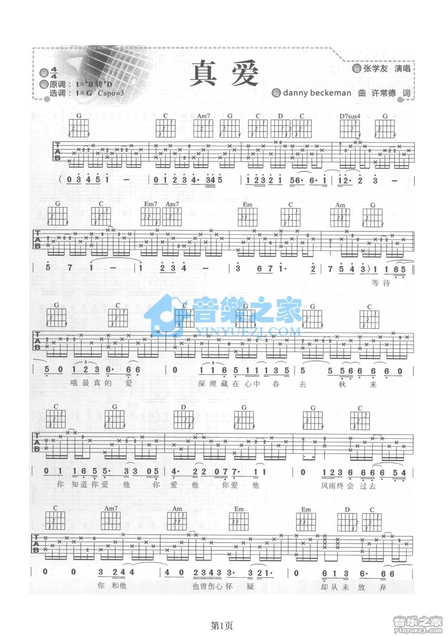曲谱介绍: G调版 张学友《真爱》吉他弹唱六线谱